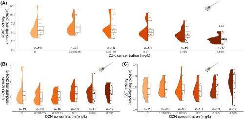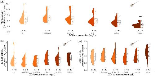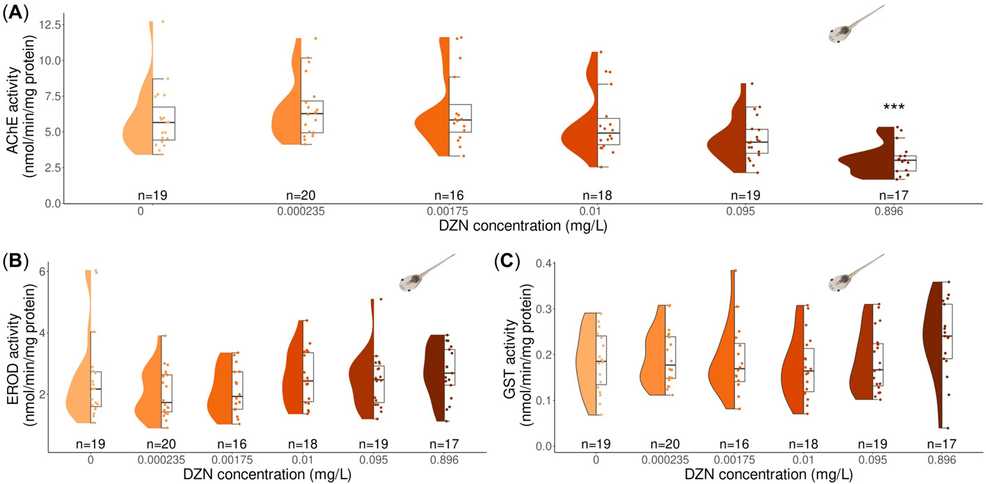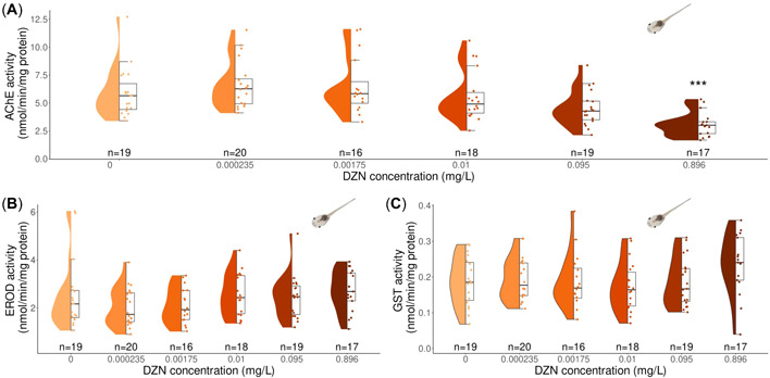 Figure 2. Acetylcholinesterase (A), ethoxyresorufin‐O‐deethylase (B), and glutathione‐S‐transferase (C) activities measured on 8‐day‐old larvae continuously exposed to six concentrations of diazinon (*p = 0.01–0.05; **p = 0.001–0.01; ***p < 0.001). p values are adjusted with the Bonferroni‐Holm method. The central bar of the boxplot is the group median. Upper and lower hinges correspond to the 25th and 75th quantiles, respectively. Upper and lower whiskers extend from the closest hinge, respectively, to the largest and the smallest values at most 1.5 times the interquartile range. Violins represent the smoothed histograms of the data distribution. Extreme outliers are not displayed in the graphs. AchE = acetylcholinesterase; DZN = diazinon; EROD = ethoxyresorufin‐O‐deethylase; GST = glutathione‐S‐transferase.