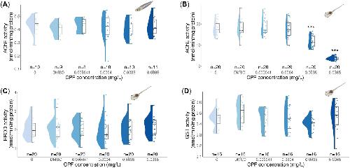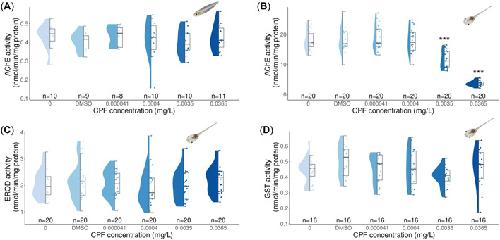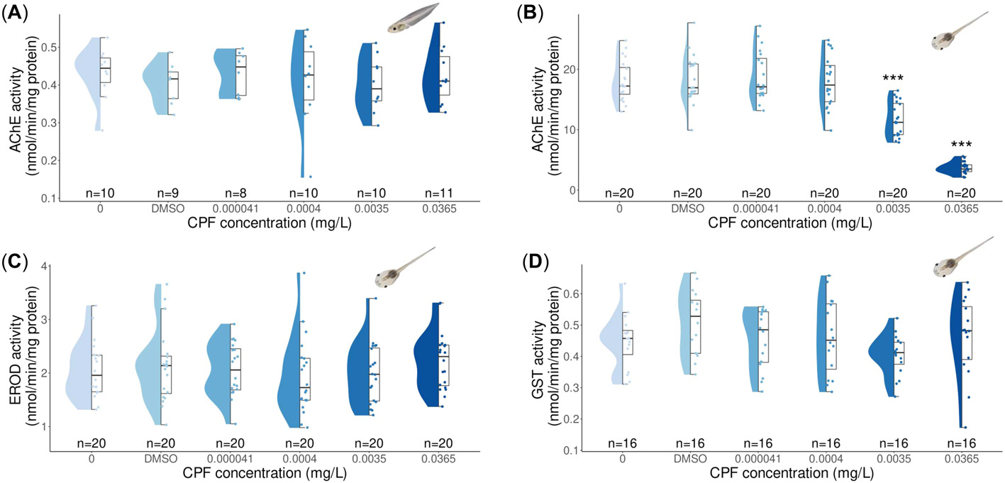 Figure 3. Acetylcholinesterase measured on 4‐day‐old embryos (A) and 8‐day‐old larvae (B) and ethoxyresorufin‐O‐deethylase and glutathione‐S‐transferase activities measured on 8‐day‐old larvae (C,D) continuously exposed to six concentrations of chlorpyrifos (*p = 0.01–0.05; **p = 0.001–0.01; ***p < 0.001). p values are adjusted with the Bonferroni‐Holm method. Plates of origin are set as a random effect in statistical models. The central bar of the boxplot is the group median. Upper and lower hinges correspond to the 25th and 75th quantiles, respectively. Upper and lower whiskers extend from the closest hinge, respectively, to the largest and the smallest values at most 1.5 times the interquartile range. Violins represent the smoothed histograms of the data distribution. Extreme outliers are not displayed in the graphs. AchE = acetylcholinesterase; DMSO = dimethyl sulfoxide; CPF = chlorpyrifos; EROD = ethoxyresorufin‐O‐deethylase; GST = glutathione‐S‐transferase.