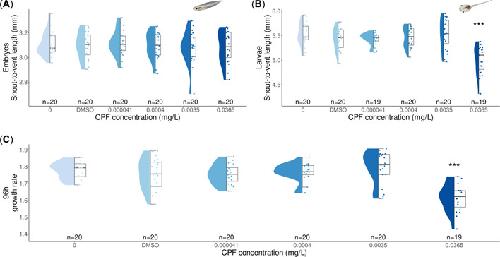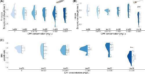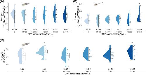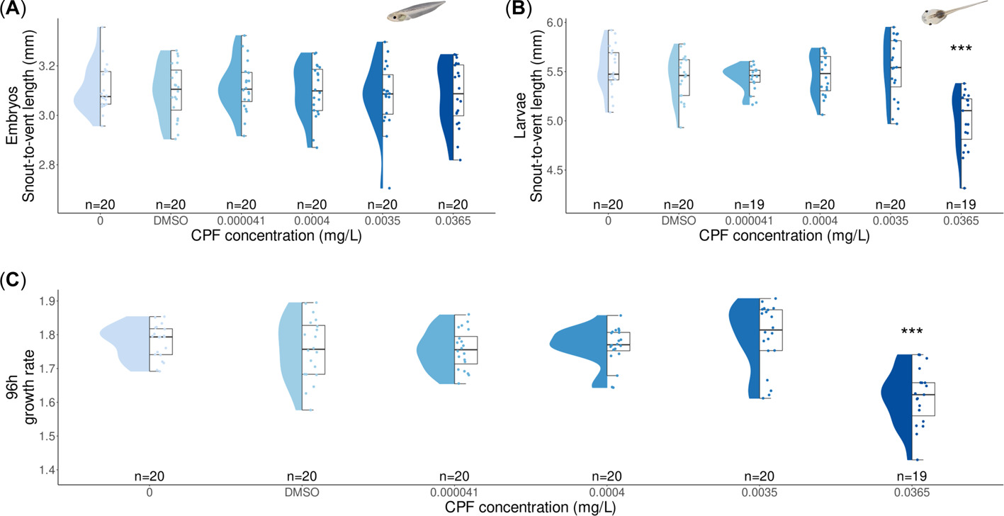 Figure 5. Snout‐to‐vent length measured on 4‐day‐old embryos (A) and 8‐day‐old larvae (B) continuously exposed to six concentrations of chlorpyrifos and the corresponding growth rate (C) (*p = 0.01–0.05; **p = 0.001–0.01; ***p < 0.001). p values are adjusted with the Bonferroni‐ Holm method. Plates of origin are set as a random effect in statistical models. The central bar of the boxplot is the group median. Upper and lower hinges correspond to the 25th and 75th quantiles, respectively. Upper and lower whiskers extend from the closest hinge, respectively, to the largest and the smallest values at most 1.5 times the interquartile range. Violins represent the smoothed histogram of the data distribution. Extreme outliers are not displayed in the graphs. DMSO = dimethyl sulfoxide; CPF = chlorpyrifos.