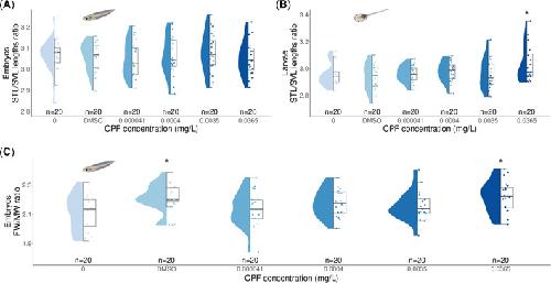 Figure 4. Snout‐to‐tail to snout‐to‐vent length ratio measured on 4‐day‐old embryos (A) and 8‐day‐old larvae (B) and fin width to muscle width ratio (C) measured on 4‐day‐old embryos continuously exposed to six concentrations of chlorpyrifos (*p = 0.01–0.05; **p = 0.001–0.01; ***p < 0.001). p values are adjusted with the Bonferroni‐Holm method. Plates of origin are set as a random effect in statistical models. The central bar of the boxplot is the group median. Upper and lower hinges correspond to the 25th and 75th quantiles, respectively. Upper and lower whiskers extend from the closest hinge, respectively, to the largest and the smallest values at most 1.5 times the interquartile range. Violins represent the smoothed histogram of the data distribution. Extreme outliers are not displayed in the graphs. STL = snout‐to‐tail length; SVL = snout‐to‐vent length; DMSO = dimethyl sulfoxide; CPF = chlorpyrifos; FW = fin width; MW = muscle width.