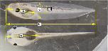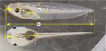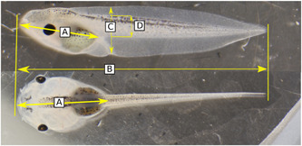 Figure 1. Morphological endpoint measurements on embryos (top) and larvae (bottom). (A) Snout‐to‐vent length, (B) snout‐to‐tail length, (C) fin width, (D) muscle width.