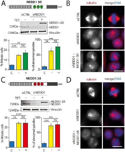 Figure 2. Mitotic phenotypes in NEDD1 silenced HeLa cells upon expression of NEDD1 triple phospho-variants. (A,C) Upper panels: western blots showing NEDD1 protein levels in control (siCTRL) and NEDD1-silenced (siNEDD1) HeLa cell lines expressing Flag-NEDD1 phospho-variants (as indicated) under tetracycline control (+TET). The anti-human NEDD1 antibody detects both endogenous and ectopically expressed Flag-NEDD1 proteins. The vinculin band was used as a loading control. Lower panels: quantifications of the percentage of mitotic cells and abnormal spindles in HeLa cells in the different experimental conditions. Blue bars correspond to control cells not induced with tetracycline (C); yellow bars are NEDD1 silenced cells not induced with tetracycline (−); green and red bars correspond to NEDD1 silenced cells induced with tetracycline that express respectively the phospho-mimetic Flag-NEDD1-3D variant or phospho-null Flag-NEDD1-3A, as indicated (+). More than 1000 cells were monitored to calculate the percentage of mitotic cells and more than 200 to quantify the spindle phenotypes. The graphs represent the average from three independent experiments. Error bars are standard deviation. ns: not significant; **P<0,01; ***P<0,001; ****P<0,0001. (B,D) Immunofluorescence of control and NEDD1-silenced (siNEDD1) HeLa cells expressing or not Flag-NEDD1 3D or Flag-NEDD1 3D, as indicated. DNA is in blue and tubulin is in red. Scale bar: 10 µm.