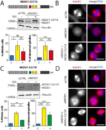 Figure 3. Mitotic phenotypes in NEDD1 silenced HeLa cells upon expression of NEDD1 S377 phospho-variants. (A,C) Upper panels: western blots showing NEDD1 protein levels in control (siCTRL) and NEDD1-silenced (siNEDD1) HeLa cell lines expressing or not Flag-NEDD1 phospho-variants at S377, as indicated (+TET). The anti-human NEDD1 antibody detects both the endogenous and ectopically expressed Flag-NEDD1 proteins. The vinculin band was used as a loading control. Lower panels: quantifications of the percentages of mitotic cells and abnormal spindles in HeLa cells in the different experimental conditions. Blue bars correspond to control cells not induced with tetracycline (C); yellow bars are NEDD1 silenced cells not induced with tetracycline (–); green and red bars correspond to NEDD1 silenced cells induced with tetracycline that express respectively the phospho-null Flag-NEDD1-S377A or phospho-mimetic Flag-NEDD1-S377D variants, as indicated (+). More than 1000 cells were monitored to calculate the percentage of mitotic cells and more than 200 to quantify the spindle phenotypes. The graphs represent the average from three independent experiments. Error bars are standard deviation. ns: not significant; **P<0,01; ***P<0,001; ****P<0,0001. (B,D) Immunofluorescence of control (siCTRL) and NEDD1-silenced (siNEDD1) HeLa cell lines expressing Flag-NEDD1-S377A or Flag-NEDD1-S377D. DNA is in blue and tubulin is in red. Scale bar: 10 µm.