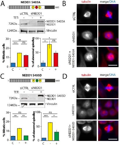 Figure 4. Mitotic phenotypes in NEDD1 silenced HeLa cells upon expression of NEDD1 S405 phospho-variants. (A,C) Upper panels: western blots showing NEDD1 protein levels in control (siCTRL) and NEDD1-silenced (siNEDD1) HeLa cell lines expressing or not Flag-NEDD1 phospho-variants at S405, as indicated (+TET). The anti-human NEDD1 antibody detects both the endogenous and ectopically expressed Flag-NEDD1 proteins. The vinculin band was used as a loading control. Lower panels: quantifications of the percentages of mitotic cells and abnormal spindles in HeLa cells in the different experimental conditions. Blue bars correspond to control cells not induced with tetracycline (C); yellow bars are NEDD1 silenced cells not induced with tetracycline (–); red and green bars correspond to NEDD1 silenced cells induced with tetracycline that express respectively the phospho-null Flag-NEDD1-S405A or phospho-mimetic Flag-NEDD1-S405D variants, as indicated (+). More than 1000 cells were monitored to calculate the percentage of mitotic cells and more than 200 to quantify the spindle phenotypes. The graphs represent the average from two independent experiments. Error bars are standard deviation. ns: not significant; *P<0,05; **P<0,01; ***P<0,001. (B,D) Immunofluorescence of control (siCTRL) and NEDD1-silenced (siNEDD1) HeLa cells expressing Flag-NEDD1 S405A or Flag-NEDD1-S405D. DNA is in blue and tubulin is in red. Scale bar: 10 µm.