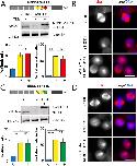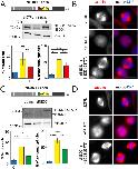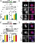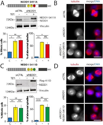 Figure 5. Mitotic phenotypes in NEDD1 silenced HeLa cells upon expression of NEDD1 S411 phospho-variants. (A,C) Upper panels: western blots showing NEDD1 protein levels in control (siCTRL) and NEDD1-silenced (siNEDD1) HeLa cells lines expressing or not Flag-NEDD1 phospho-variants at S411, as indicated (+TET). The anti-human NEDD1 antibody detects both the endogenous and ectopically expressed Flag-NEDD1 proteins. The vinculin band was used as a loading control. Lower panels: quantifications of the percentages of mitotic cells and abnormal spindles in HeLa cells in the different experimental conditions. Blue bars correspond to control cells not induced with tetracycline (C); yellow bars are NEDD1 silenced cells not induced with tetracycline (–); green and red bars correspond to NEDD1 silenced cells induced with tetracycline that express respectively the phospho-null Flag-NEDD1-S411A or phospho-mimetic Flag-NEDD1-S411D variants, as indicated (+). More than 1000 cells were monitored to calculate the percentage of mitotic cells and more than 200 to quantify the spindle phenotypes. The graphs represent the average from two (S411A) and three (S411D) independent experiments. Error bars are standard deviation. ns: not significant; *P<0,02; **P<0,01; ****P<0,0001. (B,D) Immunofluorescence of control (siCTRL) and NEDD1-silenced (siNEDD1) HeLa cells expressing Flag-NEDD1-S411A and Flag-NEDD1-S411D. DNA is in blue and tubulin is in red. Scale bar: 10 µm.