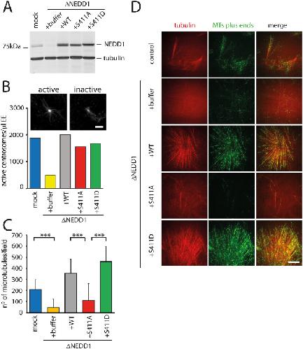 Figure 6. Role of NEDD1 S411 phosphorylation in centrosomal and RanGTP-dependent MT nucleation in Xenopus laevis egg extracts. (A) Western blots of control (mock) and NEDD1-depleted (ΔNEDD1) Xenopus laevis egg extracts supplemented or not (+buffer) with purified recombinant human Flag-NEDD1 proteins, as indicated. The anti-human NEDD1 antibody recognizes both the endogenous and exogenously added NEDD1 proteins. Tubulin was used as a loading control. (B) Activity of NEDD1 phospho-variant at S411 on the MT nucleation activity of centrosomes incubated in egg extracts. Human purified centrosomes were incubated in control (mock) and NEDD1-depleted egg extracts complemented or not with the indicated NEDD1 proteins. The number of centrosomes nucleating MTs after 30 min of incubation was counted in 30 random fields. The graph shows the quantifications from one out of two independent experiments. The images at the top show the microtubules (visualized through rhodamine-tubulin fluorescence) around purified centrosomes representative for active and inactive centrosomes. Scale bar: 10 µm. (C) Quantification of MTs assembled in RanGTP-complemented egg extracts. Control (mock) and NEDD1-depleted egg extracts complemented or not with the different human Flag-NEDD1 proteins (as indicated) were incubated for 20 min at 21°C and loaded into a flow chamber for TIRF imaging. Small amounts of Rhodamine labelled tubulin and GFP-Mal3 were added to respectively label the MTs and their growing plus-ends. The quantifications correspond to the number of MT plus ends in each field of view. Five random fields per condition in three independent experiments were analyzed. Error bars are standard deviations. ***P<0,001 (t-test). (D) Selected images from TIRF imaging of egg extracts in the different experimental conditions described and quantified in (C) Rhodamine tubulin (red) labels the MTs. GFP-Mal3 (green) labels the growing MTs plus-ends. Scale bar: 10 µm.