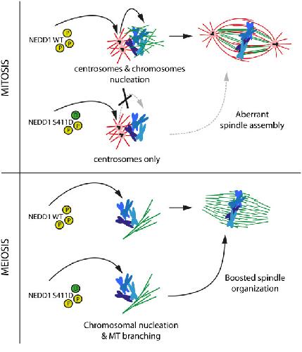 Figure 8. Model: Cdk1 phosphorylation on NEDD1 S411 is a central and critical event for spindle assembly in mitosis and meiosis. A precise regulation of NEDD1 S377, S405 and S411 phospho-events (yellow circles) define the equilibrium between MT nucleation from centrosomes (red) and chromosomes (green). The phospho-variant NEDD1 S411D that mimics a constitutively phosphorylated state (green circle) is detrimental for spindle assembly in HeLa cells but functional in Xenopus laevis egg extract. Upper panel: NEDD1-S411D may be retained at the centrosome impairing its function in the chromosome-dependent MT nucleation pathway and thereby spindle assembly. Lower panel: instead, in egg extracts, it promotes chromosome-dependent MT nucleation and branching and the fast organization of the bipolar spindle.