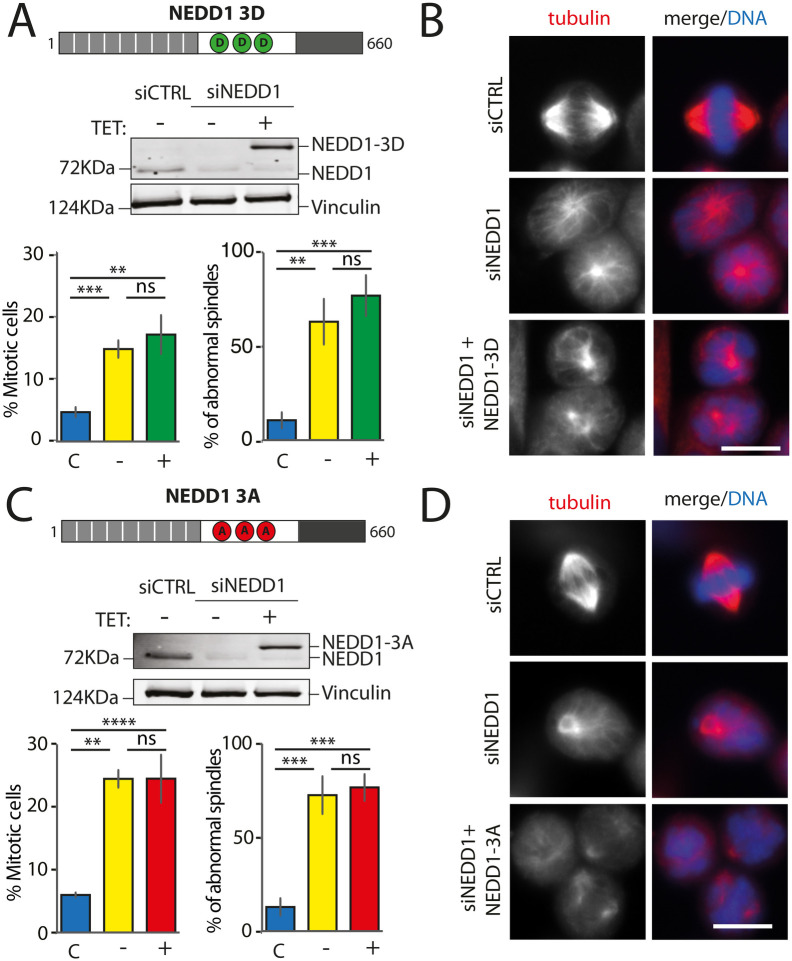 Fig. 2. Mitotic phenotypes in NEDD1 silenced HeLa cells upon expression of NEDD1 triple phospho-variants. (A,C) Upper panels: western blots showing NEDD1 protein levels in control (siCTRL) and NEDD1-silenced (siNEDD1) HeLa cell lines expressing Flag-NEDD1 phospho-variants (as indicated) under tetracycline control (+TET). The anti-human NEDD1 antibody detects both endogenous and ectopically expressed Flag-NEDD1 proteins. The vinculin band was used as a loading control. Lower panels: quantifications of the percentage of mitotic cells and abnormal spindles in HeLa cells in the different experimental conditions. Blue bars correspond to control cells not induced with tetracycline (C); yellow bars are NEDD1 silenced cells not induced with tetracycline (−); green and red bars correspond to NEDD1 silenced cells induced with tetracycline that express respectively the phospho-mimetic Flag-NEDD1-3D variant or phospho-null Flag-NEDD1-3A, as indicated (+). More than 1000 cells were monitored to calculate the percentage of mitotic cells and more than 200 to quantify the spindle phenotypes. The graphs represent the average from three independent experiments. Error bars are standard deviation. ns: not significant; **P<0,01; ***P<0,001; ****P<0,0001. (B,D) Immunofluorescence of control and NEDD1-silenced (siNEDD1) HeLa cells expressing or not Flag-NEDD1 3D or Flag-NEDD1 3D, as indicated. DNA is in blue and tubulin is in red. Scale bar: 10 µm.