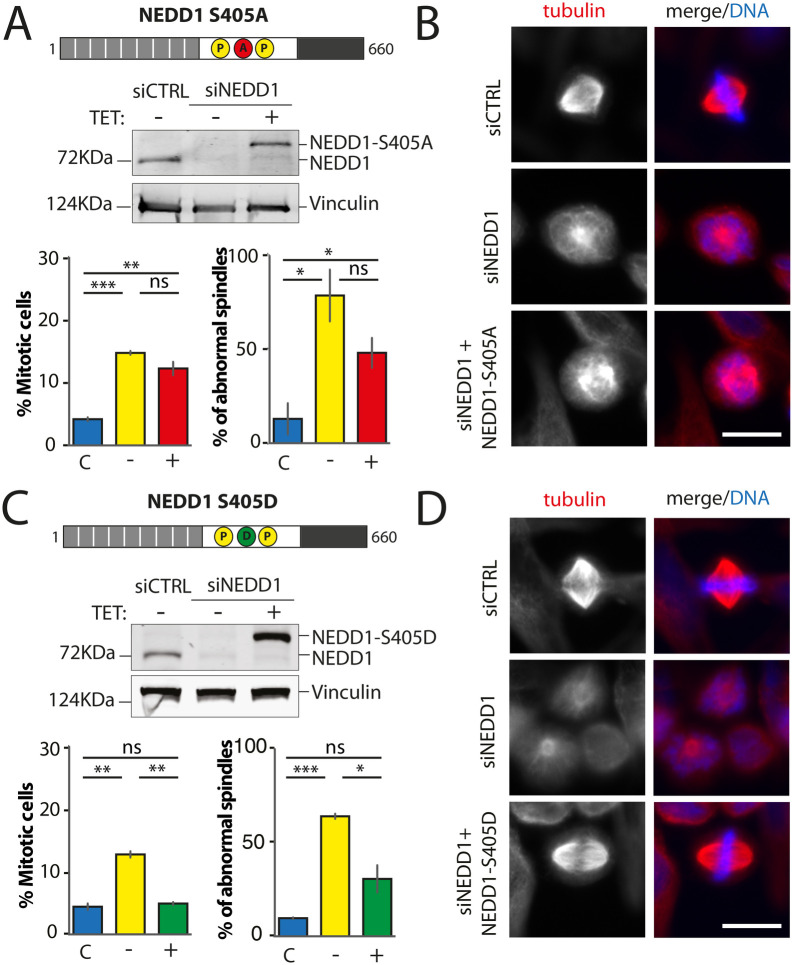 Fig. 4. Mitotic phenotypes in NEDD1 silenced HeLa cells upon expression of NEDD1 S405 phospho-variants. (A,C) Upper panels: western blots showing NEDD1 protein levels in control (siCTRL) and NEDD1-silenced (siNEDD1) HeLa cell lines expressing or not Flag-NEDD1 phospho-variants at S405, as indicated (+TET). The anti-human NEDD1 antibody detects both the endogenous and ectopically expressed Flag-NEDD1 proteins. The vinculin band was used as a loading control. Lower panels: quantifications of the percentages of mitotic cells and abnormal spindles in HeLa cells in the different experimental conditions. Blue bars correspond to control cells not induced with tetracycline (C); yellow bars are NEDD1 silenced cells not induced with tetracycline (–); red and green bars correspond to NEDD1 silenced cells induced with tetracycline that express respectively the phospho-null Flag-NEDD1-S405A or phospho-mimetic Flag-NEDD1-S405D variants, as indicated (+). More than 1000 cells were monitored to calculate the percentage of mitotic cells and more than 200 to quantify the spindle phenotypes. The graphs represent the average from two independent experiments. Error bars are standard deviation. ns: not significant; *P<0,05; **P<0,01; ***P<0,001. (B,D) Immunofluorescence of control (siCTRL) and NEDD1-silenced (siNEDD1) HeLa cells expressing Flag-NEDD1 S405A or Flag-NEDD1-S405D. DNA is in blue and tubulin is in red. Scale bar: 10 µm.