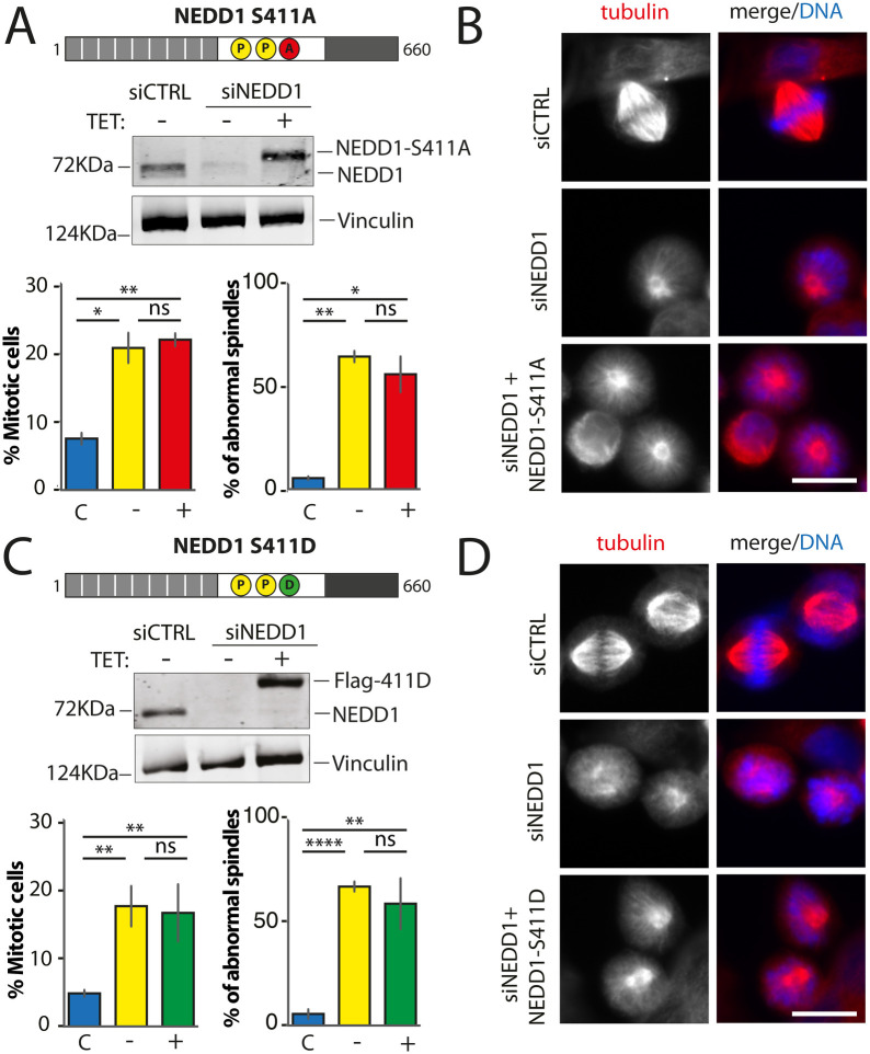 Fig. 5. Mitotic phenotypes in NEDD1 silenced HeLa cells upon expression of NEDD1 S411 phospho-variants. (A,C) Upper panels: western blots showing NEDD1 protein levels in control (siCTRL) and NEDD1-silenced (siNEDD1) HeLa cells lines expressing or not Flag-NEDD1 phospho-variants at S411, as indicated (+TET). The anti-human NEDD1 antibody detects both the endogenous and ectopically expressed Flag-NEDD1 proteins. The vinculin band was used as a loading control. Lower panels: quantifications of the percentages of mitotic cells and abnormal spindles in HeLa cells in the different experimental conditions. Blue bars correspond to control cells not induced with tetracycline (C); yellow bars are NEDD1 silenced cells not induced with tetracycline (–); green and red bars correspond to NEDD1 silenced cells induced with tetracycline that express respectively the phospho-null Flag-NEDD1-S411A or phospho-mimetic Flag-NEDD1-S411D variants, as indicated (+). More than 1000 cells were monitored to calculate the percentage of mitotic cells and more than 200 to quantify the spindle phenotypes. The graphs represent the average from two (S411A) and three (S411D) independent experiments. Error bars are standard deviation. ns: not significant; *P<0,02; **P<0,01; ****P<0,0001. (B,D) Immunofluorescence of control (siCTRL) and NEDD1-silenced (siNEDD1) HeLa cells expressing Flag-NEDD1-S411A and Flag-NEDD1-S411D. DNA is in blue and tubulin is in red. Scale bar: 10 µm.