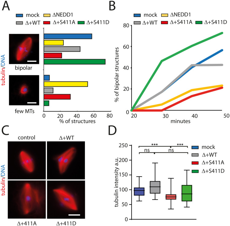 Figure 7. Role of NEDD1 S411 phosphorylation in spindle assembly in Xenopus laevis egg extracts. (A) Quantification of spindle structures assembled around sperm nuclei in cycled control (mock) and NEDD1-depleted egg extracts complemented or not with purified human Flag-NEDD1 variants as indicated. Representative images of a bipolar spindle (bipolar) and an aberrant structure typically found in NEDD1-depleted extract are shown (few MTs). Rhodamine labelled MTs (red) and DNA (blue). Scale bar: 10 μm. The graphs represent the percentage of the two types of structures in the different experimental conditions as indicated. More than 50 spindles were counted for each experimental condition. One representative out of four independent experiments with similar distributions. Scale bars: 10 μm. (B) Time course analysis of spindle assembly in the same experimental conditions as in A. More than 50 spindles were counted for each time point and experimental condition. The graph corresponds to one representative experiment out of three independent experiments. (C) Representative images of spindles assembled in control (mock) and NEDD1-depleted egg extracts complemented or not with purified human Flag-NEDD1 variants, as indicated. Rhodamine labelled MTs (red) and DNA (blue). Scale bar: 10 μm. (D) Box-and-whisker plots showing MT density in bipolar spindles assembled in the same experimental conditions as in C. MT density is expressed as the total tubulin fluorescence intensity normalized for the spindle area. More than 20 spindles were measured for each condition. The graph corresponds to one representative experiment out of three independent experiments. ***P<0,001 (t-test).
