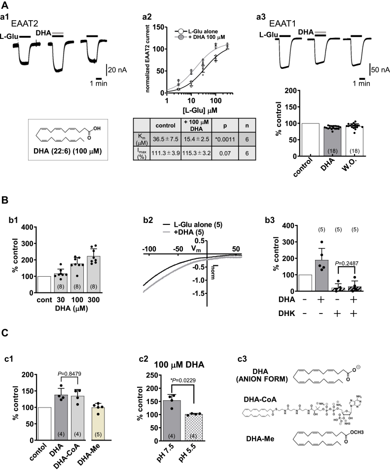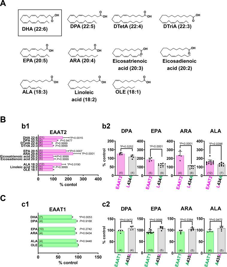 Astrocytic excitatory amino acid transporter 2 (EAAT2) plays a major role in removing the excitatory neurotransmitter L-glutamate (L-Glu) from synaptic clefts in the forebrain to prevent excitotoxicity. Polyunsaturated fatty acids such as docosahexaenoic acid (DHA, 22:6 n-3) enhance synaptic transmission, and their target molecules include EAATs. Here, we aimed to investigate the effect of DHA on EAAT2 and identify the key amino acid for DHA/EAAT2 interaction by electrophysiological recording of L-Glu-induced current in Xenopus oocytes transfected with EAATs, their chimeras, and single mutants. DHA transiently increased the amplitude of EAAT2 but tended to decrease that of excitatory amino acid transporter subtype 1 (EAAT1), another astrocytic EAAT. Single mutation of leucine (Leu) 434 to alanine (Ala) completely suppressed the augmentation by DHA, while mutation of EAAT1 Ala 435 (corresponding to EAAT2 Leu434) to Leu changed the effect from suppression to augmentation. Other polyunsaturated fatty acids (docosapentaenoic acid, eicosapentaenoic acid, arachidonic acid, and α-linolenic acid) similarly augmented the EAAT2 current and suppressed the EAAT1 current. Finally, our docking analysis suggested the most stable docking site is the lipid crevice of EAAT2, in close proximity to the L-Glu and sodium binding sites, suggesting that the DHA/Leu434 interaction might affect the elevator-like slide and/or the shapes of the other binding sites. Collectively, our results highlight a key molecular detail in the DHA-induced regulation of synaptic transmission involving EAATs.