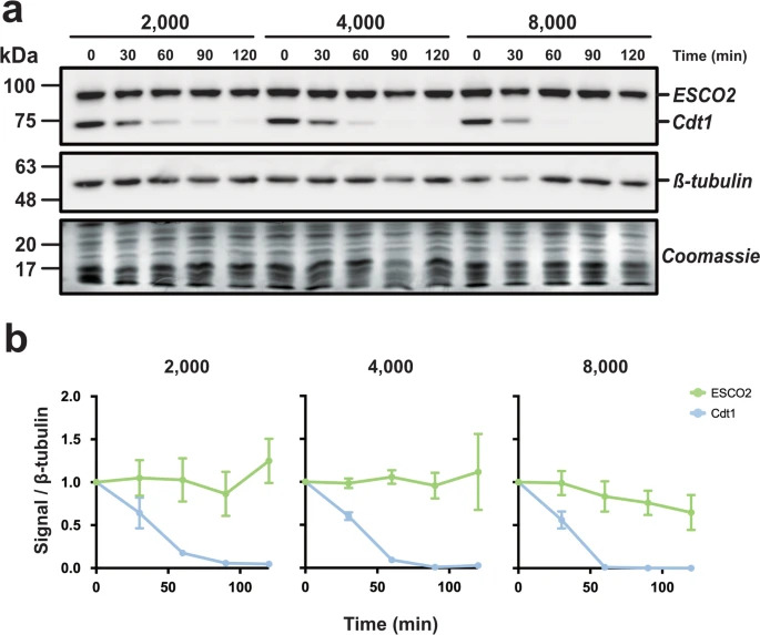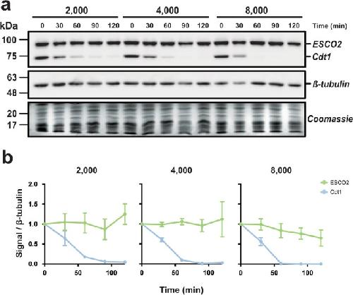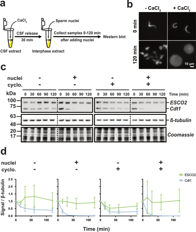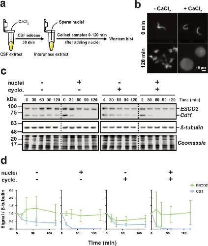 ESCO2 protein level remains constant during DNA replication. a Approach. CSF-arrested extract was induced to enter interphase by the addition of calcium (CaCl2). Thirty minutes later, sperm nuclei (2300/μl, final) were added and aliquots were collected at the indicated times. b Representative fluorescence images of nuclei sampled right after addition into extracts (0 min) and after a 120 min incubation. Nuclear morphology associated with mitotic exit at bottom right was observed after addition of calcium. DAPI stain marks nuclei. c Immunoblot analysis. Reaction samples were analyzed by immunoblot for the indicated proteins. Cyclo: Cyclohexamide was added where indicated to prevent protein translation. Solid outlines denote membrane fragments that were processed separately. Dotted lines denote where gel images were cropped. ESCO2 and Cdt1 were analyzed on the same membrane fragment. β-tubulin served as a loading control. The foot of the gel was collected and stained with Coomassie as an additional loading control. d Quantification of results. The representative experiment shown in c was repeated three times and the results were plotted as a fraction of the remaining signal for the indicated proteins normalized to the β-tubulin signal for each sample. Error bars = SD