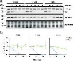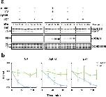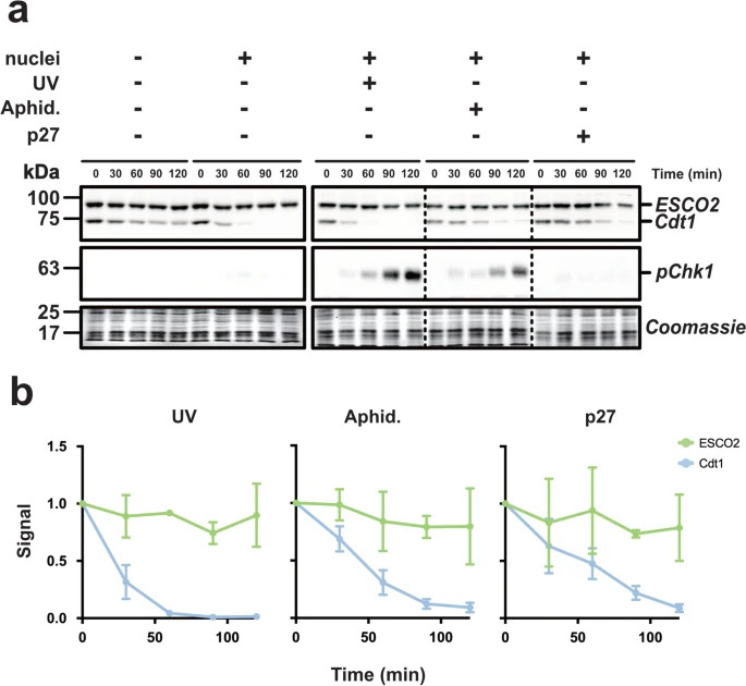 ESCO2 is stable during DNA damage signaling. a Immunoblot analysis. Reactions were assembled as in Fig. 1 with the indicated modifications. UV: sperm were UV treated before they were added to the extract. Aphid: the DNA replication inhibitor aphidicolin was added before the addition of nuclei. p27: Recombinant p27 protein was added to the extract before the addition of nuclei. Samples were collected at the indicated times and probed by immunoblot for the indicated proteins. Antibody specific for phosphorylated Chk1 kinase (pChk1) was used to confirm DNA damage signaling. Solid outlines denote membrane fragments that were processed separately. Dotted lines denote where blot images were cropped. b The representative experiment shown in a was repeated three times and the results were plotted as a fraction of remaining signal for the indicated proteins for each sample. Error bars = SD
