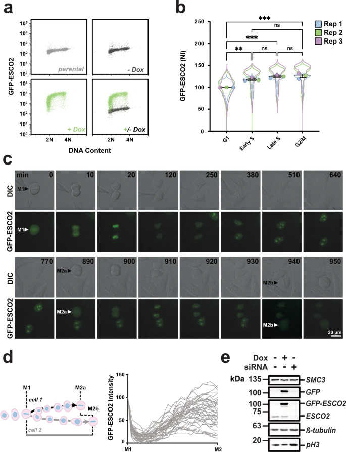 ESCO2 levels in cultured somatic cells. a Flow cytometry. Live non-extracted HeLa cells expressing GFP-ESCO2 were collected and analyzed for GFP levels and DNA content. Parental and uninduced GFP-ESCO2 (no doxycycine added) cell lines are also shown. n ≧ 5500. b Quantification of GFP-ESCO2 levels during cell cycle progression. The flow cytometry experiment shown in a was repeated three times and are shown together as a SuperPlot (Lord et al. 2020). Mean values from each replicate, normalized to their G1 mean value, are plotted together. NI, normalized intensity. Error bars = SEM. ns, not significant; **, p < 0.01; ***, p < 0.001; ****, p < 0.0001. c Time-lapse imaging. Shown are selected frames from time-lapse imaging of HeLa cells expressing GFP-ESCO2. Intervals were chosen to highlight details of cell division. Time elapsed (in minutes) since metaphase is indicated by numbers in black font. The complete movie is shown in Supplementary Video 1. d Quantification of GFP signal. Schematic at left shows how GFP fluorescence intensity was scored across a complete cell division cycle, from an initial metaphase (M1) to metaphase 2 (M2) for each daughter cell, and graphed in aggregate at right. n = 20 M1 cells, 40 M2 cells analyzed. e Immunoblot analysis. The cell line used in a–d was treated either with doxycycline to induce transgene expression or siRNA to deplete the endogenous protein, and cell lysates were analyzed by immunoblot for the indicated proteins. Solid outlines denote membrane fragments that were processed separately. SMC3, a subunit of cohesin, and β-tubulin served as loading controls. A replicate blot was prepared and probed for GFP. Phosphorylated H3 (pH3), a marker of mitotic cells, confirmed increased mitotic index in cells depleted of ESCO2 seen previously (Alomer et al. 2017)