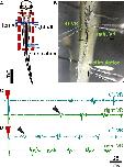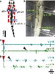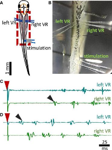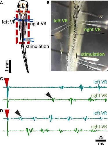 Figure 2. Experimental setup for fictive swimming. (A) Dorsal view of the tadpole with recording and stimulating electrodes in position. Left and right VR (ventral root) electrodes were positioned facing each other approximately at the 4th myotomal cleft. The stimulating electrode was always positioned on the right side at the level of the anus. Red dashed line denotes the area of open skin with the brain visible. Red dashed square area indicates the area presented in panel (B). (B) Picture of the trunk of a tadpole pinned to the Sylgard block during extracellular VR recordings. Right and left VR and stimulating electrodes, are positioned as described in A. (C) Example of an ipsilateral start of fictive swimming in response to electrical trunk skin stimulation (red arrowhead). The first VR burst is recorded on the right side of the body (right VR, ipsilateral; black arrowhead). (D) Example of a contralateral start of fictive swimming in response to electrical trunk skin stimulation (red arrowhead). The first VR burst is recorded on the left side of the body (contralateral, left VR; black arrowhead). In all experiments stimulation was delivered on the right side of the tadpole’s body.