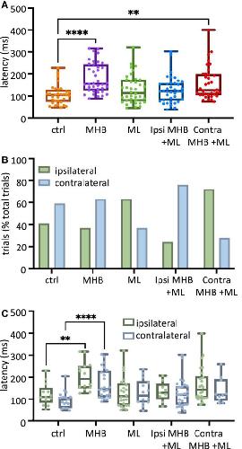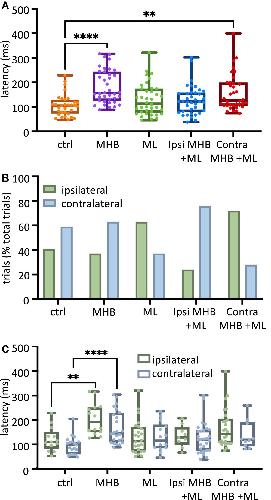 Figure 3. Midbrain lesions lead to changes in latency and side of swim initiation in freely moving animals. (A) Latency (ms) to the start of swimming in response to trunk skin stimulation. Ctrl: 104.8, 73.2–128.0 ms, MHB: 156.0, 125.9–243.5 ms, midline: 113.1, 76.79–173.8 ms, Ispi MHB + ML: 121.4, 79.76–157.7 ms, Contra MHB + ML: 126.2, 104.8–198.8 ms. (B) Percentage occurrence (% total number of trials for each experimental group) of the first behavioral motor response in relation to the side of the stimulus. Ctrl: 41% ipsilateral, 59% contralateral; MHB: 37% ipsilateral, 63% contralateral; Midline: 63% ipsilateral, 37% contralateral; Ipsi MHB + ML: 24% ipsilateral, 76% contralateral; Contra MHB + ML: 72% ipsilateral, 28% contralateral. (C) Latency to the initiation of swimming in ipsilateral vs contralateral starts. Ctrl ipsilateral 109.5, 83.3–151.2 ms, contralateral 97.6, 59.5–109.5 ms; MHB ipsilateral 191.7,150.0–251.2 ms, contralateral 145.2, 109.5–228.6 ms; Midline ipsilateral 113.1, 71.4–171.4 ms, contralateral 115.5, 84.5–180.4 ms; Ipsi MHB + ML ipsilateral 128.6, 98.8–170.2 ms, contralateral 119.1, 75.0–158.3 ms; Contra MHB + ML ipsilateral 142.9, 104.8–204.8 ms, contralateral 119.1, 92.3–189.3 ms. Ctrl: n = 10 tadpoles, trials = 32; MHB: n = 14 tadpoles, trials = 38; Midline: n = 11 tadpoles, trials = 38; Ipsi MHB + ML: n = 12 tadpoles, trials = 38; Contra MHB + ML: n = 9 tadpoles, trials = 36. For boxplot (A, C) all data are reported as median and 25–75 percentile, single data points are plotted, the middle horizontal line represents median latency, the box represents the interquartile range (IQR, 25–75 percentile), and the error bars represent the minimum and maximum values. ****p < 0.0001, **p < 0.01 for Kruskal-Wallis/Dunn’s test.