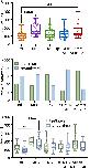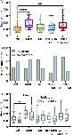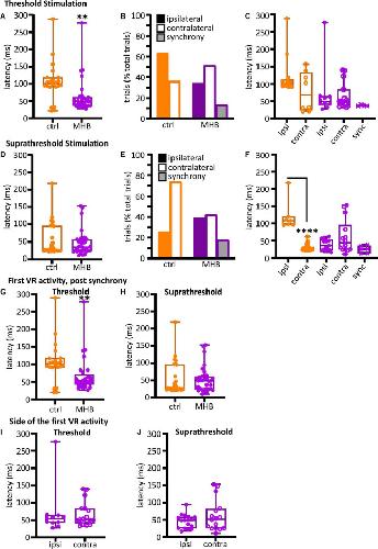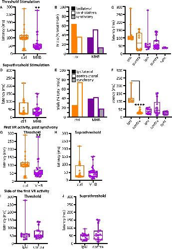 Figure 4. Midbrain-hindbrain border (MHB) lesion leads to changes in latency and side of fictive swim initiation. (A) Latencies (ms) to the first VR burst after threshold electrical stimulus was delivered to the trunk skin in control and MHB-lesioned animals. Mann-Whitney test p = 0.0049, controls 100.9, 91.02–117.8 ms vs MHB lesioned 48.1, 36.24–61.4 ms; data reported as median, 25–75 percentile. Ctrl: n = 5 tadpoles, trials = 22; MHB: n = 7 tadpoles, trials = 29. (B) Percentage occurrence (% total number of trials for each experimental group) of the first VR burst after threshold electrical stimulation in control (orange) and MHB-lesioned animals (violet). Ctrl ipsilateral 63.6% (14/22 trials), contralateral 36.4% (8/22 trials); MHB ipsilateral 34.5% (10/29 trials), contralateral 51.7% (15/29 trials), synchrony 13.8% (4/29 trials). (C) Latencies (ms) to the first VR burst after threshold electrical stimulus delivered to the trunk skin in control (orange) and MHB-lesioned (violet) animals. Solid circles represent latencies to ipsilateral first VR burst, open circles represent latencies to contralateral first VR burst, and crosses represent VR bursts recorded simultaneously on both sides of the body. Mann-Whitney test for the ctrl group, p = 0.365; Kruskal-Wallis test for the MHB-lesioned group, p = 0.1859. Ctrl ipsilateral 101.9, 93.1–112.0 ms, contralateral 67.4, 23.6–132.8 ms; MHB ipsilateral 49.8, 39.6–64.0 ms, contralateral 50.7, 36.5–83.6 ms, synchrony 36.2, 35.9–39.8 ms. Data are reported as median, 25–75 percentiles. Ctrl: n = 5 tadpoles, trials = 22; MHB: n = 7, trials = 29. (D) Latencies (ms) to the first VR burst after suprathreshold electrical stimulus delivered to the trunk skin in control and MHB-lesioned tadpoles. Mann-Whitney test, p = 0.8249; ctrl: 27.82, 24.35–95.81 ms; MHB: 35.16, 24.28–56.94 ms. Data reported as median, 25–75 percentile. Ctrl: n = 5 tadpoles, trials = 27; MHB: n = 7, trials = 33. (E) Percentage occurrence (% total number of trials for each experimental group) of the first VR burst after suprathreshold electrical stimulation of control (orange) and MHB-lesioned animals (violet). Ctrl ipsilateral 25.9% (20/27 trials), contralateral 74.1% (7/27 trials); MHB ipsilateral 39.4% (13/33 trials), contralateral 42.4% (14/33 trials), synchrony 18.2% (6/33 trials). (F) Latencies (ms) to the first VR burst after suprathreshold electrical stimulus delivered to the trunk skin of control (orange) and MHB-lesioned animals (violet). Solid circles represent latencies to ipsilateral first VR burst, open circles represent latencies to contralateral first VR burst, and crosses represent VR bursts recorded simultaneously on both sides of the body. Mann-Whitney test for the ctrl group, p < 0.0001: ipsilateral 107.9, 97.0–120.3 ms, contralateral 25.5, 23.9–32.7 ms; Kruskal-Wallis test for MHB group, p = 0.2108: ipsilateral 36.5, 23.3–3.2 ms, contralateral 43.6, 24.8–95.7 ms, synchrony 25.8, 12.7–36.1 ms. All data are reported as median, 25–75 percentile. Ctrl: n = 5 tadpoles, trials = 27; MHB-lesioned: n = 7, trials = 33). (G) Latencies (ms) to the first alternating VR burst (i.e., the first burst indicative of the start of fictive swimming) after a threshold electrical stimulus delivered to the trunk skin of control and MHB-lesioned tadpoles. Mann-Whitney test, p = 0.0049; ctrl: 100.9, 91.0–117.8 ms; MHB: 52.1, 42.0–71.1 ms. Ctrl: n = 5 tadpoles, trials = 22; MHB: n = 7, trials = 29. (H) Latencies (ms) to the first alternating VR burst after a suprathreshold electrical stimulus delivered to the trunk skin of control and MHB-lesioned tadpoles. Mann-Whitney test, p = 0.4879; ctrl: 27.8, 24.4–95.8; MHB: 48.9, 25.1–61.1 ms. Ctrl: n = 5 tadpoles, trials = 27; MHB: n = 7, trials = 33. (I) Latency (ms) for asynchronous starts (synchrony data are omitted) after a threshold stimulation and according to the side of the first VR burst (Mann-Whitney test, p = 0.8079; ipsilateral 54.6, 42.1–63.5 ms; contralateral: 51.4, 40.6–83.5 ms; n = 7 tadpoles, trials = 29). (J) Latency to asynchronous starts after a suprathreshold stimulation and according to the side of first VR burst (Mann-Whitney test, p = 0.4654; ipsilateral 48.7, 24.8–57.6 ms, contralateral 51.6, 25.2–81.3 ms; n = 7 tadpoles, trials = 33). In all panels, data collected on controls are in orange, data collected on MHB lesioned animals are in violet. In panels (A,C,D,F–J) single data points are plotted; boxes indicate 5–95 percentile; middle horizontal line in each box represents median value; error bars indicate minimum and maximum values. In panels (B,E); filled bars: ipsilateral first VR burst; white bars: contralateral first VR burst; grey bars: synchronous VR first burst. All data reported in the figure legend are expressed as median, 25–75 percentile. **p < 0.01, ****p < 0.0001 for Kruskal-Wallis/Dunn’s test.