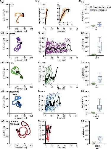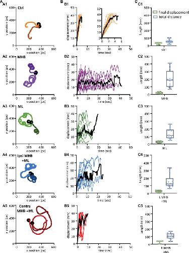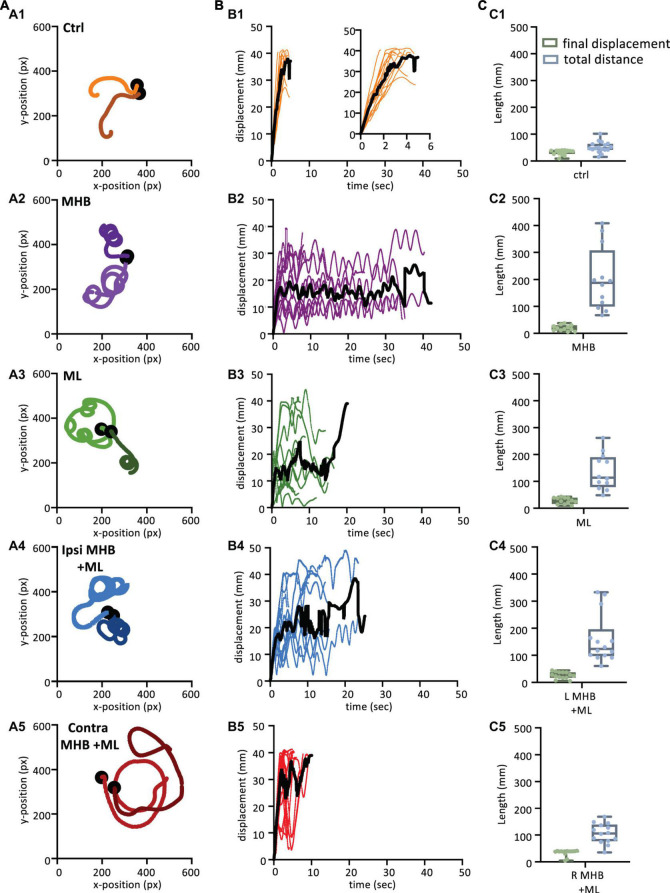Figure 5. Midbrain lesions lead to stark changes in the trajectory of tadpole swimming (A). Example swim trajectories (n = 2) for each animal group extracted from the FastTrack Software. The starting position is symbolised by the black dot. (B) Displacement time graphs of each animal trial (coloured lines) to show the tadpoles deviation from the starting position for each animal group (See section “Materials and methods” for calculation). The average is represented by the black line for each animals group. An increase in displacement refers to the tadpole swimming away from the starting position, while a decrease represents the tadpole swimming closer to the starting position. (C) Boxplot of the final displacement and total distance travelled for each animal trial within the respective animal group. For panels (B,C), Control: n = 10, trials = 17; MHB: n = 9, trials = 12; Midline: n = 8, trials = 12; Ipsi MHB + ML: n = 9, trials = 14; Contra MHB + ML: n = 10, trials = 14. For boxplot, single data points are plotted, the middle horizontal line represents the median value, the box represents the interquartile range (IQR, 25–75 percentile), and the extended vertical bars represent the minimum and maximum values.