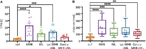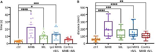 Figure 6. Midbrain lesions affect sustained swimming. (A) The average duration of swim episodes in control and midbrain lesioned animals. Controls swam for 3.3 ± 0.3 s after stimulation. MHB: 22.7 ± 3.8 s; ML: 11.0 ± 1.3 s; Ipsi MHB + ML: 13.5 ± 1.9 s; Contra MHB + ML: 6.3 ± 0.6 s. Reported as mean ± SEM. Single data points are plotted; the middle horizontal line represents the mean and the extended vertical bars represent the SEM. (B) Controls travelled 47.4, 41.9–63.7 mm (note the size of the arena had a radius of 45 mm). MHB: 187.5, 99.7–307.5 mm; ML: 113.7, 79.4–189.6 mm; Ipsi MHB + ML: 123.9, 97.7–195.7 mm; Contra MHB + ML: 105.8, 77.4–138.3 mm. Sample size identical to those in Figure 5. For panel (A) Results are reported as mean ± SEM; single data points are plotted, the horizontal line represents mean duration, error bars represent the SEM. For panel (B) Results are reported as median and IQR (25–75 percentile); for boxplot, single data points are plotted, the middle horizontal line represents median distance, the box represents the interquartile range (IQR, 25–75 percentile), and the extended vertical bars represent the minimum and maximum values. ****p < 0.0001, ***p < 0.001, **p < 0.01 and *p < 0.05 for ANOVA/Dunnett’s and Kruskal-Wallis/Dunn’s test.