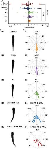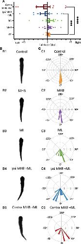 Figure 7. Midbrain lesions cause tail deflections. (A) The mean tail angle at rest (no stimulus applied), prior to trunk skin stimulation. Ctrl: 0.9o ± 1.1o, n = 5 tadpoles, 12 trials; MHB: 3.1o ± 3.1o, n = 6, 13 trials; ML: 4.8o ± 7.0o, n = 4, 8 trials; Ipsi MHB + ML: –5.1o ± 8.7o, n = 5, 10 trials; Contra MHB + ML: –7.8o ± 13.3o, n = 4, 8 trials. Reported as mean ± SEM. Single data points are plotted, the middle horizontal line represents the mean, and the extended vertical bars represent the SEM. ****p < 0.0001, ***p = 0.003, ANOVA/Dunnett’s. (B) A single example of the tadpole’s body posture from still images of resting tadpoles, representative of each experimental group. (C) Circular plot of the frequency distribution of the tail angle before swim starts. Each circular segment represents the number of values. Bin width is 5.8o.