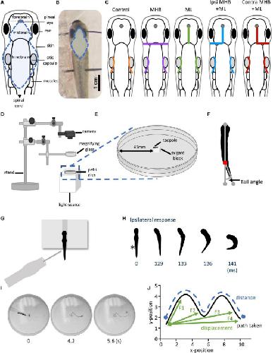 Figure 1. Midbrain lesions and design of behavioral experiments. Dorsal view of the Xenopus laevis tadpole at developmental stage 37/38. (A) Diagram of the tadpole’s anatomical features and key CNS regions. Blue dotted outline represents the area where the skin was opened to allow access to the brain. (B) The tadpole viewed under a dissection microscope with pins running across the body, through the eyes and the notochord just caudal to the obex. Blue dotted line denotes the area of open skin with the brain visible. (C) Representation of the midbrain lesions. Ctrl (Control, orange); trigeminal nerve transection at the level of the otic capsule. The trigeminal nerve transections were performed on all experimental groups. MHB (Midbrain-Hindbrain Border lesion, purple); a transverse lesion through the MHB. ML (Midline lesion, green); lesion along the midline of the midbrain. Ipsi MHB + ML (Left/Ipsilateral MHB and ML lesion, blue); combination of left MHB and ML lesions. Contra MHB + ML (Right/Contralateral MHB and ML lesion, red); combination of right MHB and ML lesions. (D) Schematic diagram of the behavioural set up with (E) a zoomed in section of the tadpole’s starting position (not drawn to scale). (F) Illustration of the tail angle measurement used in subsequent figures. Red dot indicates the level of the anus, referred to as the starting point of the tail (G) The tadpoles starting position from a dorsal view. The tadpole is positioned upright into a groove carved onto a Sylgard block. Stimulation is applied on the left side of the tadpole’s trunk skin, at the level of the anus, using a glass pipette with an attached fine rabbit hair (CUSTOM–MADE). (H) Individual frames taken from high-speed videos recorded at 420 frames per second (fps). A short poke with a single rabbit hair to trunk skin receptors on the left side (*; time = 0 ms) initiated a swim response at 129 ms. (I) Individual video frames of a tadpole’s swim trajectory captured from a 30 fps recording. In this example the control animal trial starts at stimulation (0 s) to the end of the tadpole’s swim cycle (5.6 s). A novel tracking software, FastTrack Software, was used to detect and trace the tadpole’s body using an automatic tracking algorithm. (J) Schematic showing the path taken (black), the distance (blue) and the displacement (green). Here, the displacement is described as the shortest distance from the starting position to the next frame (position), with frame intervals indicated as F1, F2 and F3, with F4 representing the final displacement. The distance here is described as the measure of the path taken from the starting to the final position. Abbreviations: Ctrl, control; MHB, midbrain-hindbrain border; ML, midbrain midline; Ipsi MHB + ML, left/ipsilateral midbrain-hindbrain border and midbrain midline; Contra MHB + ML, right/contralateral midbrain-hindbrain border, and midbrain midline.