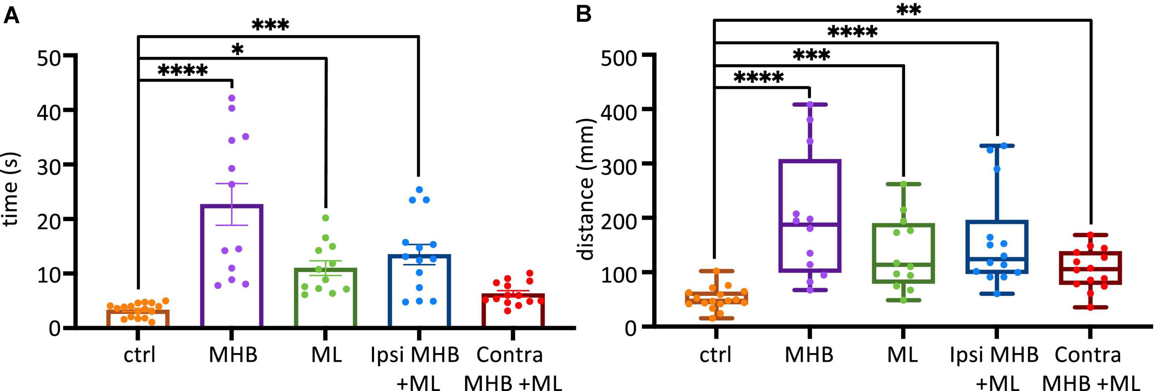 FIGURE 6. Midbrain lesions affect sustained swimming. (A) The average duration of swim episodes in control and midbrain lesioned animals. Controls swam for 3.3 ± 0.3 s after stimulation. MHB: 22.7 ± 3.8 s; ML: 11.0 ± 1.3 s; Ipsi MHB + ML: 13.5 ± 1.9 s; Contra MHB + ML: 6.3 ± 0.6 s. Reported as mean ± SEM. Single data points are plotted; the middle horizontal line represents the mean and the extended vertical bars represent the SEM. (B) Controls travelled 47.4, 41.9–63.7 mm (note the size of the arena had a radius of 45 mm). MHB: 187.5, 99.7–307.5 mm; ML: 113.7, 79.4–189.6 mm; Ipsi MHB + ML: 123.9, 97.7–195.7 mm; Contra MHB + ML: 105.8, 77.4–138.3 mm. Sample size identical to those in Figure 5. For panel (A) Results are reported as mean ± SEM; single data points are plotted, the horizontal line represents mean duration, error bars represent the SEM. For panel (B) Results are reported as median and IQR (25–75 percentile); for boxplot, single data points are plotted, the middle horizontal line represents median distance, the box represents the interquartile range (IQR, 25–75 percentile), and the extended vertical bars represent the minimum and maximum values. ****p < 0.0001, ***p < 0.001, **p < 0.01 and *p < 0.05 for ANOVA/Dunnett’s and Kruskal-Wallis/Dunn’s test.