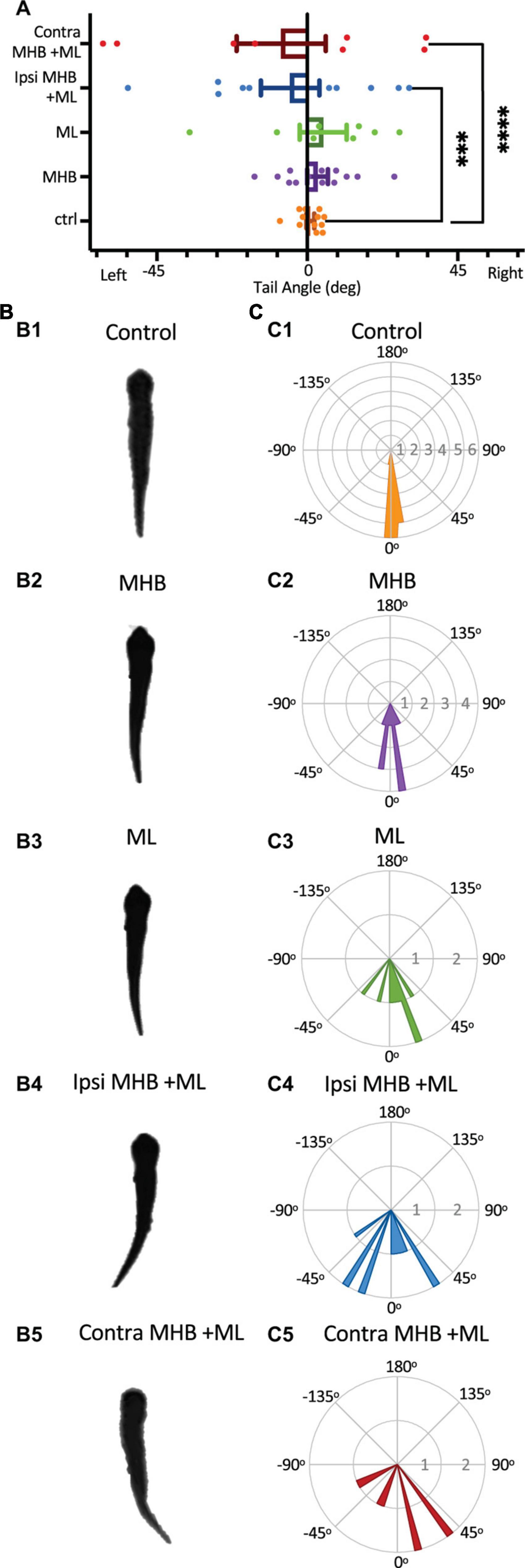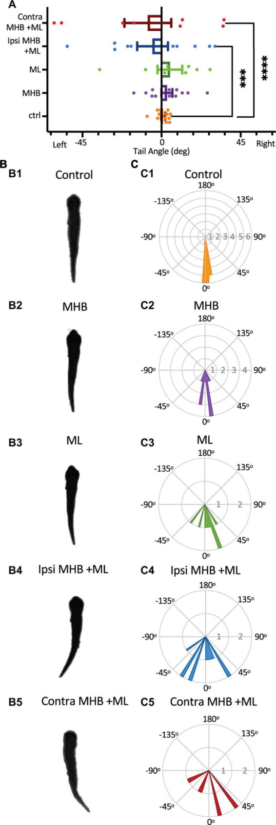 FIGURE 7. Midbrain lesions cause tail deflections. (A) The mean tail angle at rest (no stimulus applied), prior to trunk skin stimulation. Ctrl: 0.9o ± 1.1o, n = 5 tadpoles, 12 trials; MHB: 3.1o ± 3.1o, n = 6, 13 trials; ML: 4.8o ± 7.0o, n = 4, 8 trials; Ipsi MHB + ML: –5.1o ± 8.7o, n = 5, 10 trials; Contra MHB + ML: –7.8o ± 13.3o, n = 4, 8 trials. Reported as mean ± SEM. Single data points are plotted, the middle horizontal line represents the mean, and the extended vertical bars represent the SEM. ****p < 0.0001, ***p = 0.003, ANOVA/Dunnett’s. (B) A single example of the tadpole’s body posture from still images of resting tadpoles, representative of each experimental group. (C) Circular plot of the frequency distribution of the tail angle before swim starts. Each circular segment represents the number of values. Bin width is 5.8o.
