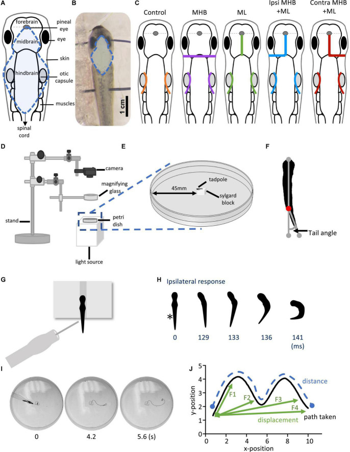 FIGURE 1. Midbrain lesions and design of behavioral experiments. Dorsal view of the Xenopus laevis tadpole at developmental stage 37/38. (A) Diagram of the tadpole’s anatomical features and key CNS regions. Blue dotted outline represents the area where the skin was opened to allow access to the brain. (B) The tadpole viewed under a dissection microscope with pins running across the body, through the eyes and the notochord just caudal to the obex. Blue dotted line denotes the area of open skin with the brain visible. (C) Representation of the midbrain lesions. Ctrl (Control, orange); trigeminal nerve transection at the level of the otic capsule. The trigeminal nerve transections were performed on all experimental groups. MHB (Midbrain-Hindbrain Border lesion, purple); a transverse lesion through the MHB. ML (Midline lesion, green); lesion along the midline of the midbrain. Ipsi MHB + ML (Left/Ipsilateral MHB and ML lesion, blue); combination of left MHB and ML lesions. Contra MHB + ML (Right/Contralateral MHB and ML lesion, red); combination of right MHB and ML lesions. (D) Schematic diagram of the behavioural set up with (E) a zoomed in section of the tadpole’s starting position (not drawn to scale). (F) Illustration of the tail angle measurement used in subsequent figures. Red dot indicates the level of the anus, referred to as the starting point of the tail (G) The tadpoles starting position from a dorsal view. The tadpole is positioned upright into a groove carved onto a Sylgard block. Stimulation is applied on the left side of the tadpole’s trunk skin, at the level of the anus, using a glass pipette with an attached fine rabbit hair (CUSTOM–MADE). (H) Individual frames taken from high-speed videos recorded at 420 frames per second (fps). A short poke with a single rabbit hair to trunk skin receptors on the left side (*; time = 0 ms) initiated a swim response at 129 ms. (I) Individual video frames of a tadpole’s swim trajectory captured from a 30 fps recording. In this example the control animal trial starts at stimulation (0 s) to the end of the tadpole’s swim cycle (5.6 s). A novel tracking software, FastTrack Software, was used to detect and trace the tadpole’s body using an automatic tracking algorithm. (J) Schematic showing the path taken (black), the distance (blue) and the displacement (green). Here, the displacement is described as the shortest distance from the starting position to the next frame (position), with frame intervals indicated as F1, F2 and F3, with F4 representing the final displacement. The distance here is described as the measure of the path taken from the starting to the final position. Abbreviations: Ctrl, control; MHB, midbrain-hindbrain border; ML, midbrain midline; Ipsi MHB + ML, left/ipsilateral midbrain-hindbrain border and midbrain midline; Contra MHB + ML, right/contralateral midbrain-hindbrain border, and midbrain midline.