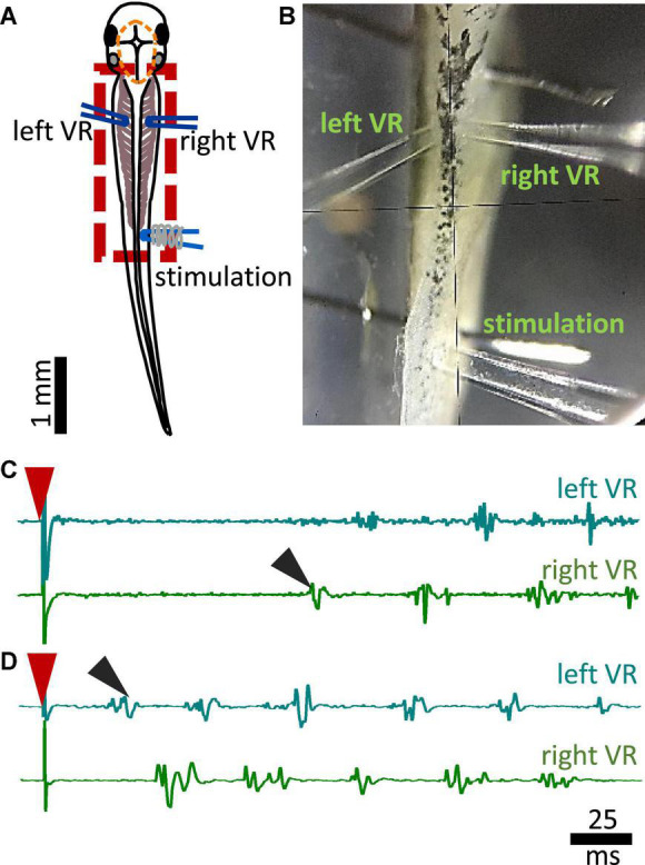 FIGURE 2. Experimental setup for fictive swimming. (A) Dorsal view of the tadpole with recording and stimulating electrodes in position. Left and right VR (ventral root) electrodes were positioned facing each other approximately at the 4th myotomal cleft. The stimulating electrode was always positioned on the right side at the level of the anus. Red dashed line denotes the area of open skin with the brain visible. Red dashed square area indicates the area presented in panel (B). (B) Picture of the trunk of a tadpole pinned to the Sylgard block during extracellular VR recordings. Right and left VR and stimulating electrodes, are positioned as described in A. (C) Example of an ipsilateral start of fictive swimming in response to electrical trunk skin stimulation (red arrowhead). The first VR burst is recorded on the right side of the body (right VR, ipsilateral; black arrowhead). (D) Example of a contralateral start of fictive swimming in response to electrical trunk skin stimulation (red arrowhead). The first VR burst is recorded on the left side of the body (contralateral, left VR; black arrowhead). In all experiments stimulation was delivered on the right side of the tadpole’s body.