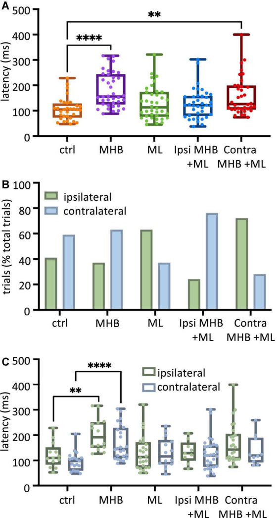 FIGURE 3. Midbrain lesions lead to changes in latency and side of swim initiation in freely moving animals. (A) Latency (ms) to the start of swimming in response to trunk skin stimulation. Ctrl: 104.8, 73.2–128.0 ms, MHB: 156.0, 125.9–243.5 ms, midline: 113.1, 76.79–173.8 ms, Ispi MHB + ML: 121.4, 79.76–157.7 ms, Contra MHB + ML: 126.2, 104.8–198.8 ms. (B) Percentage occurrence (% total number of trials for each experimental group) of the first behavioral motor response in relation to the side of the stimulus. Ctrl: 41% ipsilateral, 59% contralateral; MHB: 37% ipsilateral, 63% contralateral; Midline: 63% ipsilateral, 37% contralateral; Ipsi MHB + ML: 24% ipsilateral, 76% contralateral; Contra MHB + ML: 72% ipsilateral, 28% contralateral. (C) Latency to the initiation of swimming in ipsilateral vs contralateral starts. Ctrl ipsilateral 109.5, 83.3–151.2 ms, contralateral 97.6, 59.5–109.5 ms; MHB ipsilateral 191.7,150.0–251.2 ms, contralateral 145.2, 109.5–228.6 ms; Midline ipsilateral 113.1, 71.4–171.4 ms, contralateral 115.5, 84.5–180.4 ms; Ipsi MHB + ML ipsilateral 128.6, 98.8–170.2 ms, contralateral 119.1, 75.0–158.3 ms; Contra MHB + ML ipsilateral 142.9, 104.8–204.8 ms, contralateral 119.1, 92.3–189.3 ms. Ctrl: n = 10 tadpoles, trials = 32; MHB: n = 14 tadpoles, trials = 38; Midline: n = 11 tadpoles, trials = 38; Ipsi MHB + ML: n = 12 tadpoles, trials = 38; Contra MHB + ML: n = 9 tadpoles, trials = 36. For boxplot (A, C) all data are reported as median and 25–75 percentile, single data points are plotted, the middle horizontal line represents median latency, the box represents the interquartile range (IQR, 25–75 percentile), and the error bars represent the minimum and maximum values. ****p < 0.0001, **p < 0.01 for Kruskal-Wallis/Dunn’s test.