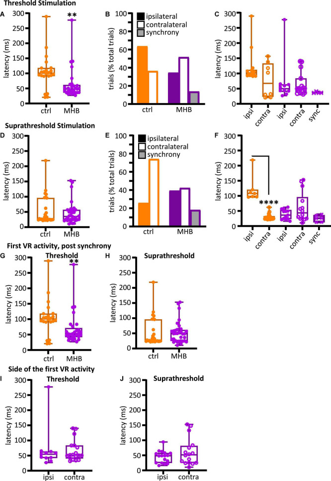FIGURE 4. Midbrain-hindbrain border (MHB) lesion leads to changes in latency and side of fictive swim initiation. (A) Latencies (ms) to the first VR burst after threshold electrical stimulus was delivered to the trunk skin in control and MHB-lesioned animals. Mann-Whitney test p = 0.0049, controls 100.9, 91.02–117.8 ms vs MHB lesioned 48.1, 36.24–61.4 ms; data reported as median, 25–75 percentile. Ctrl: n = 5 tadpoles, trials = 22; MHB: n = 7 tadpoles, trials = 29. (B) Percentage occurrence (% total number of trials for each experimental group) of the first VR burst after threshold electrical stimulation in control (orange) and MHB-lesioned animals (violet). Ctrl ipsilateral 63.6% (14/22 trials), contralateral 36.4% (8/22 trials); MHB ipsilateral 34.5% (10/29 trials), contralateral 51.7% (15/29 trials), synchrony 13.8% (4/29 trials). (C) Latencies (ms) to the first VR burst after threshold electrical stimulus delivered to the trunk skin in control (orange) and MHB-lesioned (violet) animals. Solid circles represent latencies to ipsilateral first VR burst, open circles represent latencies to contralateral first VR burst, and crosses represent VR bursts recorded simultaneously on both sides of the body. Mann-Whitney test for the ctrl group, p = 0.365; Kruskal-Wallis test for the MHB-lesioned group, p = 0.1859. Ctrl ipsilateral 101.9, 93.1–112.0 ms, contralateral 67.4, 23.6–132.8 ms; MHB ipsilateral 49.8, 39.6–64.0 ms, contralateral 50.7, 36.5–83.6 ms, synchrony 36.2, 35.9–39.8 ms. Data are reported as median, 25–75 percentiles. Ctrl: n = 5 tadpoles, trials = 22; MHB: n = 7, trials = 29. (D) Latencies (ms) to the first VR burst after suprathreshold electrical stimulus delivered to the trunk skin in control and MHB-lesioned tadpoles. Mann-Whitney test, p = 0.8249; ctrl: 27.82, 24.35–95.81 ms; MHB: 35.16, 24.28–56.94 ms. Data reported as median, 25–75 percentile. Ctrl: n = 5 tadpoles, trials = 27; MHB: n = 7, trials = 33. (E) Percentage occurrence (% total number of trials for each experimental group) of the first VR burst after suprathreshold electrical stimulation of control (orange) and MHB-lesioned animals (violet). Ctrl ipsilateral 25.9% (20/27 trials), contralateral 74.1% (7/27 trials); MHB ipsilateral 39.4% (13/33 trials), contralateral 42.4% (14/33 trials), synchrony 18.2% (6/33 trials). (F) Latencies (ms) to the first VR burst after suprathreshold electrical stimulus delivered to the trunk skin of control (orange) and MHB-lesioned animals (violet). Solid circles represent latencies to ipsilateral first VR burst, open circles represent latencies to contralateral first VR burst, and crosses represent VR bursts recorded simultaneously on both sides of the body. Mann-Whitney test for the ctrl group, p < 0.0001: ipsilateral 107.9, 97.0–120.3 ms, contralateral 25.5, 23.9–32.7 ms; Kruskal-Wallis test for MHB group, p = 0.2108: ipsilateral 36.5, 23.3–3.2 ms, contralateral 43.6, 24.8–95.7 ms, synchrony 25.8, 12.7–36.1 ms. All data are reported as median, 25–75 percentile. Ctrl: n = 5 tadpoles, trials = 27; MHB-lesioned: n = 7, trials = 33). (G) Latencies (ms) to the first alternating VR burst (i.e., the first burst indicative of the start of fictive swimming) after a threshold electrical stimulus delivered to the trunk skin of control and MHB-lesioned tadpoles. Mann-Whitney test, p = 0.0049; ctrl: 100.9, 91.0–117.8 ms; MHB: 52.1, 42.0–71.1 ms. Ctrl: n = 5 tadpoles, trials = 22; MHB: n = 7, trials = 29. (H) Latencies (ms) to the first alternating VR burst after a suprathreshold electrical stimulus delivered to the trunk skin of control and MHB-lesioned tadpoles. Mann-Whitney test, p = 0.4879; ctrl: 27.8, 24.4–95.8; MHB: 48.9, 25.1–61.1 ms. Ctrl: n = 5 tadpoles, trials = 27; MHB: n = 7, trials = 33. (I) Latency (ms) for asynchronous starts (synchrony data are omitted) after a threshold stimulation and according to the side of the first VR burst (Mann-Whitney test, p = 0.8079; ipsilateral 54.6, 42.1–63.5 ms; contralateral: 51.4, 40.6–83.5 ms; n = 7 tadpoles, trials = 29). (J) Latency to asynchronous starts after a suprathreshold stimulation and according to the side of first VR burst (Mann-Whitney test, p = 0.4654; ipsilateral 48.7, 24.8–57.6 ms, contralateral 51.6, 25.2–81.3 ms; n = 7 tadpoles, trials = 33). In all panels, data collected on controls are in orange, data collected on MHB lesioned animals are in violet. In panels (A,C,D,F–J) single data points are plotted; boxes indicate 5–95 percentile; middle horizontal line in each box represents median value; error bars indicate minimum and maximum values. In panels (B,E); filled bars: ipsilateral first VR burst; white bars: contralateral first VR burst; grey bars: synchronous VR first burst. All data reported in the figure legend are expressed as median, 25–75 percentile. **p < 0.01, ****p < 0.0001 for Kruskal-Wallis/Dunn’s test.