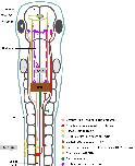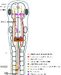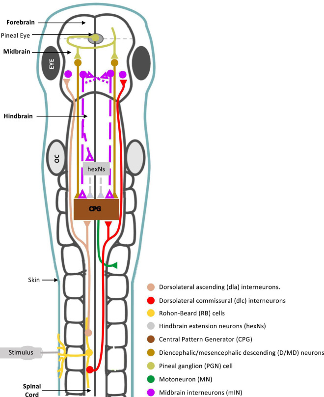 Figure 8. Summary diagram of known and proposed midbrain neural circuitry. Diagram of the brain and spinal cord of the Xenopus laevis tadpole at developmental stage 37/38, showing already known and newly proposed neuronal connections involved in the initiation of swimming in response to photic and mechanical stimuli. Mechanosensory Rohon-Beard (RB) neurons innervate the skin of the trunk and tail. The central axons of the RB neurons transmit excitation via sensory interneurons namely dorsolateral commissural (dlc) and dorsolateral ascending (dla) interneurons. Both interneurons project ascending axons to the hindbrain and midbrain. The second sensory pathway presented in this diagram involves the excitation of the pineal eye photoreceptors in response to light dimming. Axons of pineal ganglion cells form synapses on both sides of the midbrain. Midbrain diencephalic/mesencephalic descending (D/MD) neurons are excited by the pineal ganglion cells, and project caudally into the hindbrain and spinal cord where they could excite Central Pattern Generators (CPGs) directly, or via a novel hindbrain population of sensory memory neurons (hindbrain extension neurons; hexNs), which have been proposed to extend the sensory signal between the sensory pathway and reticulospinal neurons of the swimming CPG. The proposed midbrain interneurons (mINs), if different to D/MD neurons, may also project to the opposite side of the midbrain and/or directly or indirectly to hexNs and the CPG. Each neuron type population and colour coding are displayed in the list. Circles represent groups of cell bodies, single lines represent axons, and triangles represent excitatory synapses. Proposed neuronal connections are indicated by dashed lines.