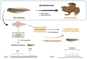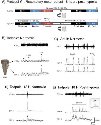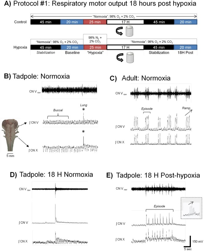Fig. 1. A) Series I protocol: respiratory motor output 18 h post-hypoxia. B-E) Representative traces of raw and integrated respiratory motor output recorded from cranial nerves V and X (trigeminal: CN V; vagus: CN X) of amphibian brainstem preparations. Pre-metamorphic preparations kept under normoxic (oxygenated) conditions exhibit regular, small amplitude gill bursting. High-amplitude lung bursts are sporadic and concurrent with bursting on CN X (B). C) Normoxic brainstem preparations derived from adult frogs exhibit increased lung burst frequency with bursts often grouped into episodes. The amplitude of each burst within an episode may be greater than the previous one, forming a “ramping” episode (i.e. lung inflation cycle). Gill bursting may be present (as illustrated) or absent. D) Example trace of a time control tadpole brainstem preparation following 18 h normoxic incubation showing similar motor output as (B). Gill bursting and sporadic lung bursts are observed. E) Exposing pre-metamorphic brainstems to hypoxia followed by 18 h normoxic incubation augmented lung burst frequency, with bursts often occurring episodically and with amplitude ramping (inset). Gill bursting was observed.
