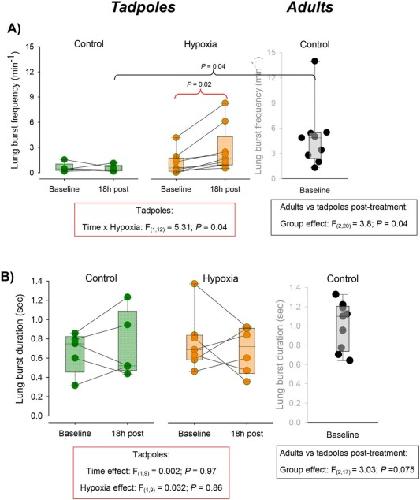 Fig. 2. Series I: pre-metamorphic brainstems show augmented lung burst frequency 18 h post-hypoxia. Comparison of lung burst frequency (A) and duration (B) at baseline and 18 h following exposure to normoxia (green; time controls) or hypoxia (0% O2, 15 min; orange). The right panel presents data from sexually mature adult frog brainstems (grey) maintained under normoxic conditions for comparison. Main ANOVA results are presented in boxes whereas post-hoc test results are presented as brackets on the graphs. (For interpretation of the references to colour in this figure legend, the reader is referred to the web version of this article.)