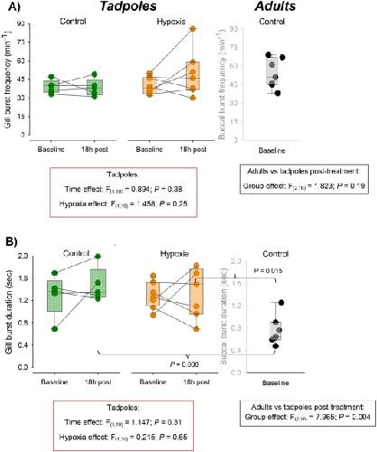 Fig. 3. Series I: prior exposure to hypoxia does not alter gill motor output. Data for gill burst frequency (A) and duration (B) are presented for pre-metamorphic brainstems at baseline and 18 h following exposure to normoxia (green; time controls) or hypoxia (0% O2, 25 min; orange). Data from normoxic adult frog brainstems (grey) is shown in the right panel for comparison. Main ANOVA results are presented in boxes whereas post-hoc test results are presented as brackets on the graphs. (For interpretation of the references to colour in this figure legend, the reader is referred to the web version of this article.)