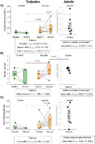 Fig. 4. Series I: prior exposure to hypoxia increases expression of lung burst episodes by pre-metamorphic brainstems. A) Comparison of pre-metamorphic lung burst episode frequency at baseline and 18 h following exposure to normoxia (green; time controls) or hypoxia (0% O2, 25 min; orange). Expression of episodes is increased 18 h post-hypoxia compared to time controls. Data from normoxic adult frog brainstems (grey; right panel) illustrates that episode frequency is higher in frogs than time control pre-metamorphic. Results of number of bursts per episode (B) and ratio of preparations exhibiting amplitude ramping (C) are shown as in (A). Following hypoxia, the number of bursts per episode was higher than time controls but less than observed for adults. The ratio of preparations exhibiting amplitude ramping was variable across treatments and development. Main ANOVA results are presented in boxes whereas post-hoc test results are presented as brackets on the graphs. (For interpretation of the references to colour in this figure legend, the reader is referred to the web version of this article.)