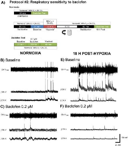 Fig. 5. A) Series II protocol: sensitivity of respiratory motor output to baclofen. B-G) Representative traces of raw and integrated respiratory motor output recorded from pre-metamorphic brainstem preparations in normoxia (B,D,F) and 18 h post-hypoxia (C,E,G). Notation as in Fig. 1. (B) Respiratory motor output from normoxic brainstem preparations showed regular gill bursting with sporadic lung bursts. Baclofen resulted in dose-dependent inhibition of lung and gill motor output that was reversible upon washout (D,F). C) Representative trace of a tadpole brainstem preparation recorded 18 h post-hypoxia. E,F) Despite augmented lung burst frequency in these preparations, baclofen application inhibited lung and gill bursting.