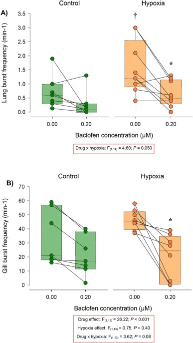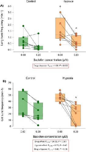 Fig. 6. Series II: signaling through GABAB receptors inhibits lung and gill motor output in pre-metamorphic tadpoles. Lung burst frequency (A) and gill burst frequency (B) were reversibly inhibited by the selective GABAB agonist, baclofen. Results were similar between baseline (normoxic) preparations and those tested 18 h following hypoxic challenge. Main ANOVA results are presented in boxes; † indicates a value significantly different from corresponding normoxia value at P < 0.05; * indicates a value significantly different from corresponding baseline (0.0 μM) value at P < 0.05.
