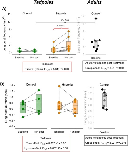 Fig. 2. Series I: pre-metamorphic brainstems show augmented lung burst frequency 18 h post-hypoxia. Comparison of lung burst frequency (A) and duration (B) at baseline and 18 h following exposure to normoxia (green; time controls) or hypoxia (0% O2, 15 min; orange). The right panel presents data from sexually mature adult frog brainstems (grey) maintained under normoxic conditions for comparison. Main ANOVA results are presented in boxes whereas post-hoc test results are presented as brackets on the graphs. (For interpretation of the references to colour in this figure legend, the reader is referred to the web version of this article.)
