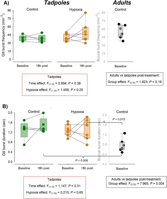 Fig. 3. Series I: prior exposure to hypoxia does not alter gill motor output. Data for gill burst frequency (A) and duration (B) are presented for pre-metamorphic brainstems at baseline and 18 h following exposure to normoxia (green; time controls) or hypoxia (0% O2, 25 min; orange). Data from normoxic adult frog brainstems (grey) is shown in the right panel for comparison. Main ANOVA results are presented in boxes whereas post-hoc test results are presented as brackets on the graphs. (For interpretation of the references to colour in this figure legend, the reader is referred to the web version of this article.)