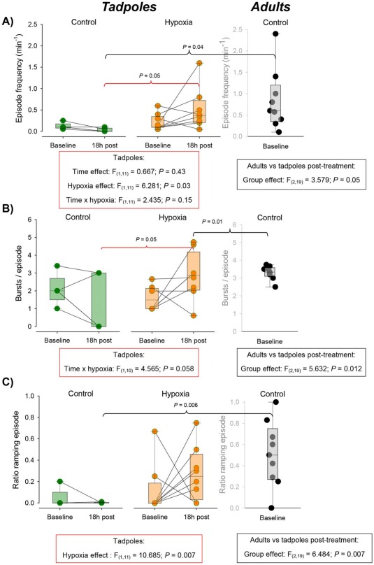Fig. 4. Series I: prior exposure to hypoxia increases expression of lung burst episodes by pre-metamorphic brainstems. A) Comparison of pre-metamorphic lung burst episode frequency at baseline and 18 h following exposure to normoxia (green; time controls) or hypoxia (0% O2, 25 min; orange). Expression of episodes is increased 18 h post-hypoxia compared to time controls. Data from normoxic adult frog brainstems (grey; right panel) illustrates that episode frequency is higher in frogs than time control pre-metamorphic. Results of number of bursts per episode (B) and ratio of preparations exhibiting amplitude ramping (C) are shown as in (A). Following hypoxia, the number of bursts per episode was higher than time controls but less than observed for adults. The ratio of preparations exhibiting amplitude ramping was variable across treatments and development. Main ANOVA results are presented in boxes whereas post-hoc test results are presented as brackets on the graphs. (For interpretation of the references to colour in this figure legend, the reader is referred to the web version of this article.)
