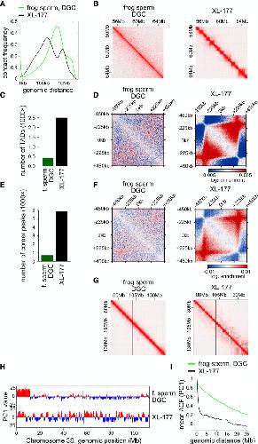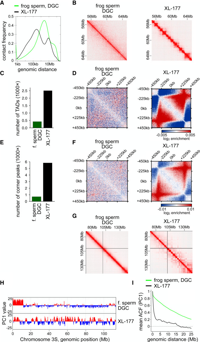 Figure 1. The frog sperm genome is organized without TADs and corner peaks. (A) Contact frequency as a function of genomic distance for Xenopus laevis (frog) sperm enriched by density gradient centrifugation (DGC) compared with frog XL-177 cells. (B) Normalized Hi-C matrices for the same samples as in A in the region of Chr1S:55–65 Mb at 25-kb resolution. (C) Number of TADs called for the same samples as in A. (D) Aggregate contact frequencies (coverage and distance corrected) around the 135 550- to 650-kb-long TADs called in XL-177 cells, for the same samples as in A. (E) Number of corner peaks called for the same samples as in A. (F) Aggregate contact frequencies (coverage and distance corrected) around the 109 550- to 650-kb-long corner peaks called in XL-177 cells, for the same samples as in A. (G) Normalized Hi-C matrices for the same samples as in A in the region of Chr3L:70–150 Mb at 100-kb resolution. (H) Compartment tracks from principal component analysis for the same samples as in A. (I) The autocorrelation of the PC1 value as a function of genomic distance, for the same samples as in A.
