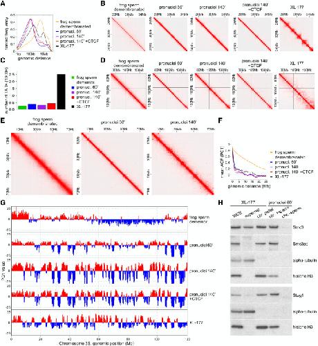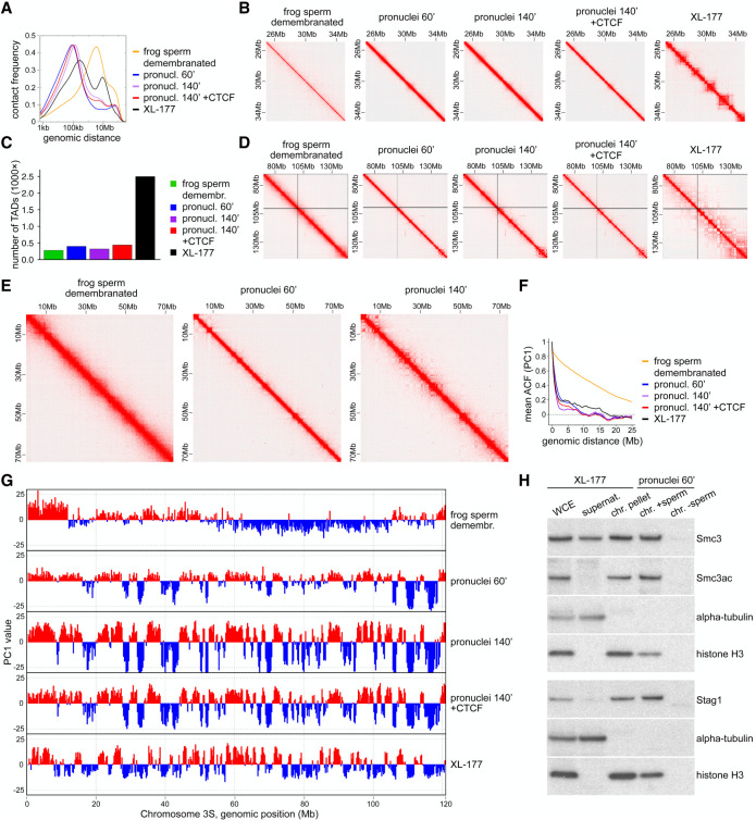 Figure 3. Demembranated frog sperm is remodeled upon incubation in egg extract. (A) Contact frequency as a function of genomic distance for demembranated frog sperm, demembranated frog sperm in Xenopus egg extract after 60 min (pronuclei 60′) or 140′ (pronuclei 140′), pronuclei 140′ with addition of 50 nM CTCF protein, and frog XL-177 cells. (B) Normalized Hi-C matrices for the same samples as in A in the region of Chr1S:25–35 Mb at 25-kb resolution. (C) Number of TADs called for the same samples as in A. (D) Normalized Hi-C matrices for the same samples as in A in the region of Chr3L:70–150 Mb at 100-kb resolution. (E) Normalized Hi-C matrices for three of the samples in A in the region of Chr1S:0–75 Mb at 100-kb resolution. (F) The autocorrelation of the PC1 value as a function of genomic distance, for the same samples as in A. (G) Compartment tracks from principal component analysis for the same samples as in A. (H) Immunoblotting of chromatin isolated from pronuclei 60′, with or without sperm, in comparison with chromatin fractioning (whole cell extract, supernatant, chromatin pellet) of XL-177 cells.