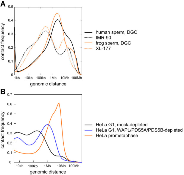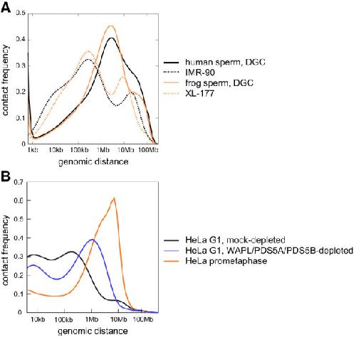 Figure 6. The genome organization of human and frog sperm differs from that of somatic cells. (A) Contact frequency as a function of genomic distance for human sperm enriched by DGC, human IMR-90 cells by Rao et al. (2014), frog sperm enriched by DGC, and frog XL-177 cells. (B) Contact frequency as a function of genomic distance for human HeLa cells in G1 that were mock-depleted or joint-WAPL/PDS5A/PDS5B-depleted and for HeLa cells in prometaphase, all from Wutz et al. (2017).