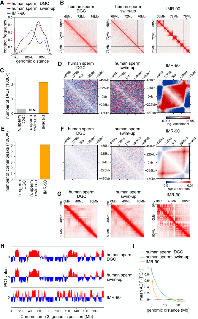 Figure 2. The human sperm genome is organized without TADs and corner peaks. (A) Contact frequency as a function of genomic distance for human sperm enriched by DGC and swim-up compared with human IMR-90 cells by Rao et al. (2014). (B) Normalized Hi-C matrices for the same samples as in A in the region of Chr3:67–77 Mb at 25-kb resolution with TAD calling indicated using black lines. (C) Number of TADs called for the same samples as in A. (N.A.) Artifacts in TAD calling owing to low sequencing depth. (D) Aggregate contact frequencies (coverage and distance corrected) around the 138 550- to 650-kb-long TADs called in IMR-90 cells, for the same samples as in A. (E) Number of corner peaks called for the same samples as in A. (F) Aggregate contact frequencies (coverage and distance corrected) around the 249 550- to 650-kb-long corner peaks called in IMR-90 cells, for the same samples as in A. (G) Normalized Hi-C matrices for the same samples as in A in the region of Chr3:0–90 Mb at 250-kb resolution. (H) Compartment tracks from principal component analysis for the same samples as in A. (I) The autocorrelation of the PC1 value as a function of genomic distance, for the same samples as in A.