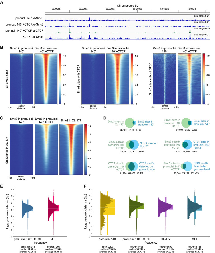 Figure 4. Addition of recombinant CTCF to Xenopus pronuclei repositions cohesin. (A) Anti-Smc3 and anti-CTCF ChIP-seq tracks of demembranated frog sperm in Xenopus egg extract after 140 min (pronuclei 140′), pronuclei 140′ with addition of 50 nM CTCF protein, and frog XL-177 cells in the region of Chr6L:52.94–53.05 Mb. Pronuclei 140′ and pronuclei 140′ +CTCF data sets were obtained in a calibrated ChIP-seq experiment. (B) For pronuclei 140′ and pronuclei 140′ with addition of 50 nM CTCF protein, heat maps showing Smc3 enrichment over all Smc3 binding sites detectable in any of the two data sets, binding sites with Smc3-CTCF colocalization, and Smc3 binding sites that do not colocalize with CTCF, sorted by strength. (C) For pronuclei 140′, pronuclei 140′ with addition of 50 nM CTCF protein, and XL-177 cells, heat maps showing Smc3 enrichment over Smc3 binding sites in XL-177 cells, sorted by strength. (D) Venn diagrams showing the overlap of called Smc3 or CTCF binding sites for the same samples as in A, as well as CTCF binding motifs detected algorithmically on a genomic level, with numbers of shared and nonshared sites indicated below each Venn diagram. (E) Distribution of genomic distances between neighboring CTCF binding sites for pronuclei 140′ with addition of 50 nM CTCF protein compared with mouse MEF cells by Busslinger et al. (2017), shown using box plots with the internal distribution overlaid. Genomic distances are scaled with log10. Continuous white lines represent medians; dashed white lines represent averages. (F) Distribution of genomic distances between neighboring Smc3 binding sites for pronuclei 140′, pronuclei 140′ with addition of 50 nM CTCF protein, XL-177 cells, and mouse MEF cells, shown using box plots with the internal distribution overlaid. Genomic distances are scaled with log10. Continuous white lines represent medians; dashed white lines represent averages.