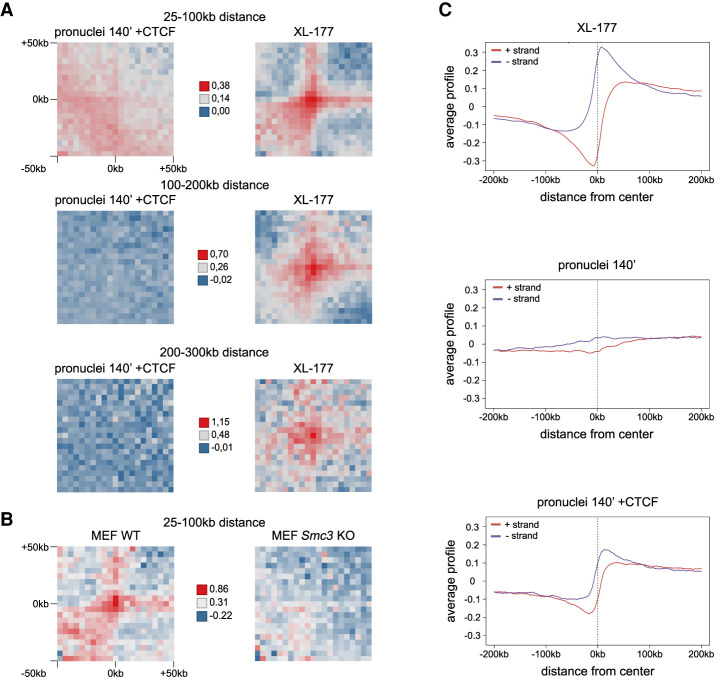 Figure 5. Addition of recombinant CTCF to Xenopus pronuclei fails to induce typical corner peak or TAD formation but generates weak contacts between Smc3 sites at very small distances. (A) Log2 of observed/control of aggregate contact frequencies between consecutive, directly adjacent Smc3 binding sites with a distance between the binding sites as indicated and 5-kb bin size, for demembranated frog sperm in Xenopus egg extract after 140 min (pronuclei 140′), pronuclei 140′ with addition of 50 nM CTCF protein, and frog XL-177 cells. To calculate control values, Smc3 binding sites were shifted by 10 Mb. (B) Log2 of observed/control of aggregate contact frequencies for mouse WT MEF cells and Smc3 KO MEF cells between consecutive, directly adjacent Smc3 binding sites in WT MEF cells with a distance between the binding sites of 25–100 kb and 5-kb bin size. Hi-C data by Banigan et al. (2023); ChIP-seq data from this study. To calculate control values, Smc3 binding sites were shifted by 10 Mb. (C) Average profiles of the directionality index for XL-177 cells, pronuclei 140′, and pronuclei 140′ with addition of 50 nM CTCF protein over unambiguously oriented CTCF binding sites detected in pronuclei 140′ +CTCF.