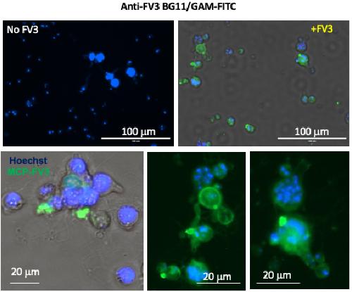 Figure 1. Detection of FV3 binding to Bd using fluorescence microscopy. FV3 was added to Bd culture at 1 MOI in 1 mL volume and incubated for 24 h. Detection of FV3 was performed by staining with the anti-MCP mAb BG11 followed by FITC-conjugates goat anti-mouse Ab. Nuclei were stained with Hoechst. Negative control, Mock FV3-exposed Bd culture. Stained samples were visualized under a EVOS FL Digital Inverted Fluorescence Microscope.