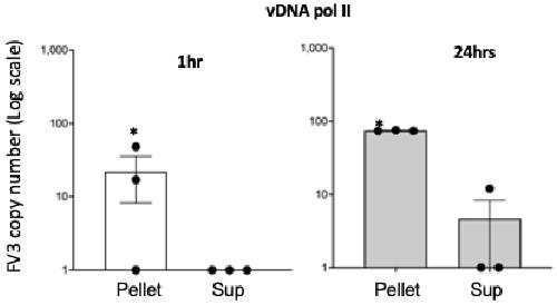 Figure 2. Detection of FV3 binding to Bd using qPCR. FV3 was incubated with Bd at 1 MOI in 1 mL volume for 1 and 24 h. Samples were then centrifuged at 700× g and both pellets and supernatants were subjected to qPCR with FV3 specific primers (vDNA pol). * Statistical differences (p < 0.05).